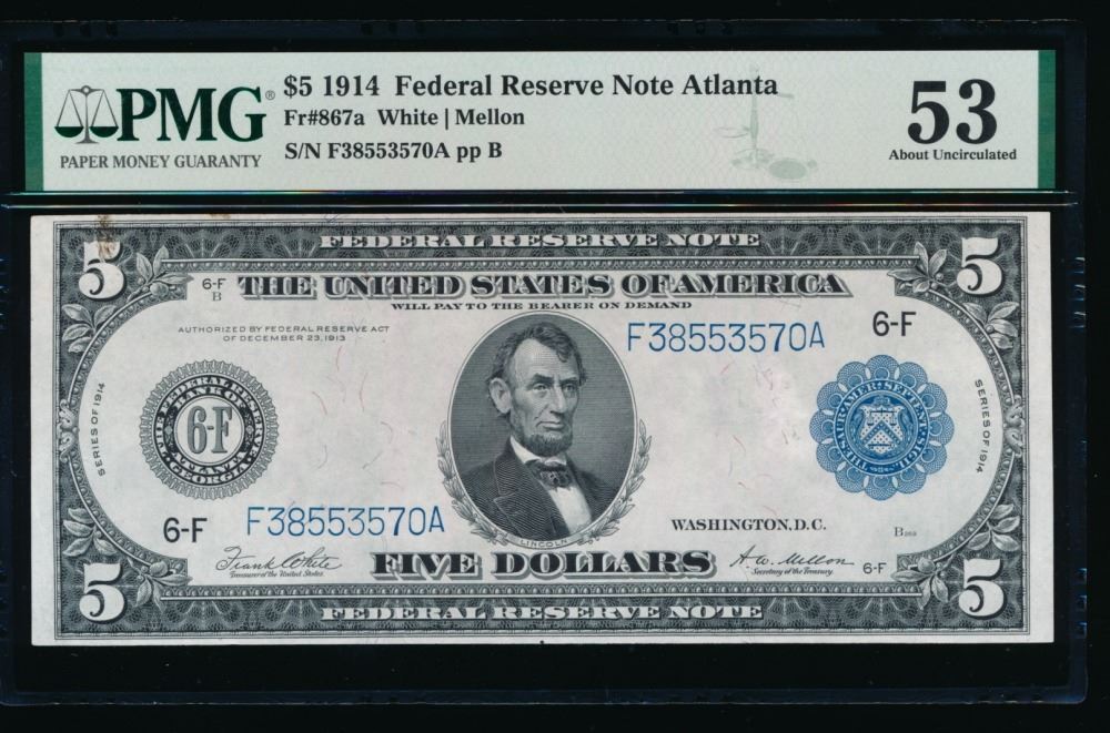 One 1914 $5 Atlanta Federal Reserve Note PMG 53.