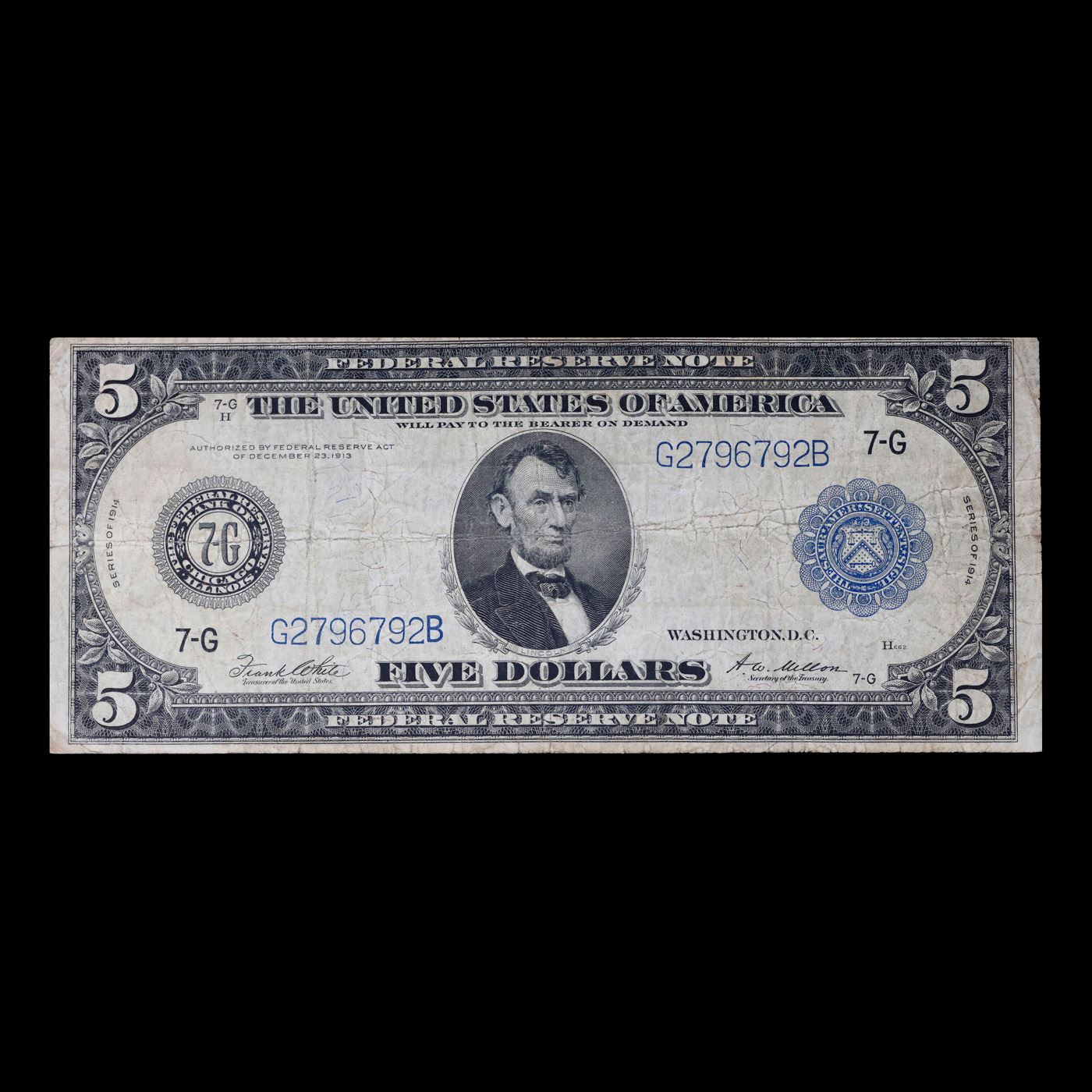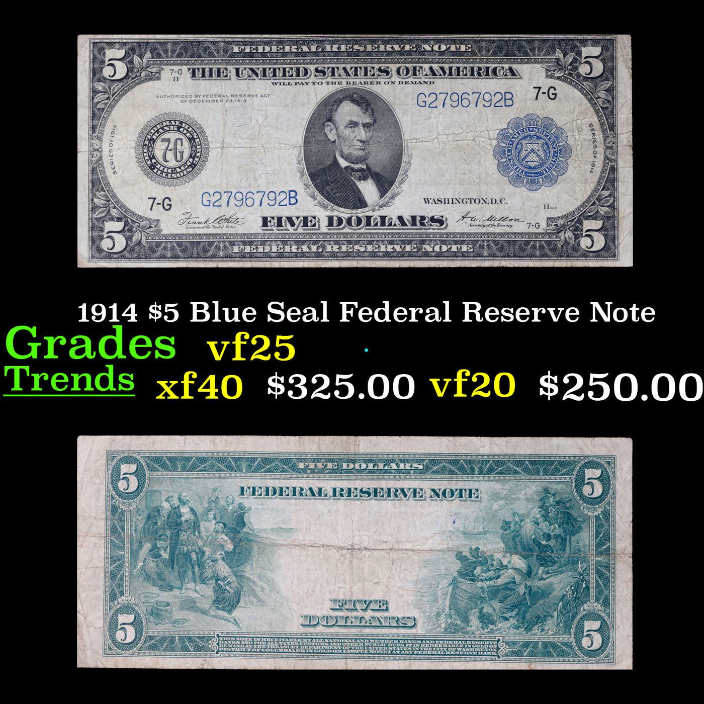 1914 $5 Blue Seal Federal Reserve Note Grades vf+. Blue seal and serial number 1914 Federal Reserve notes are some of the most known large size currency. Abraham Lincoln is shown each note.