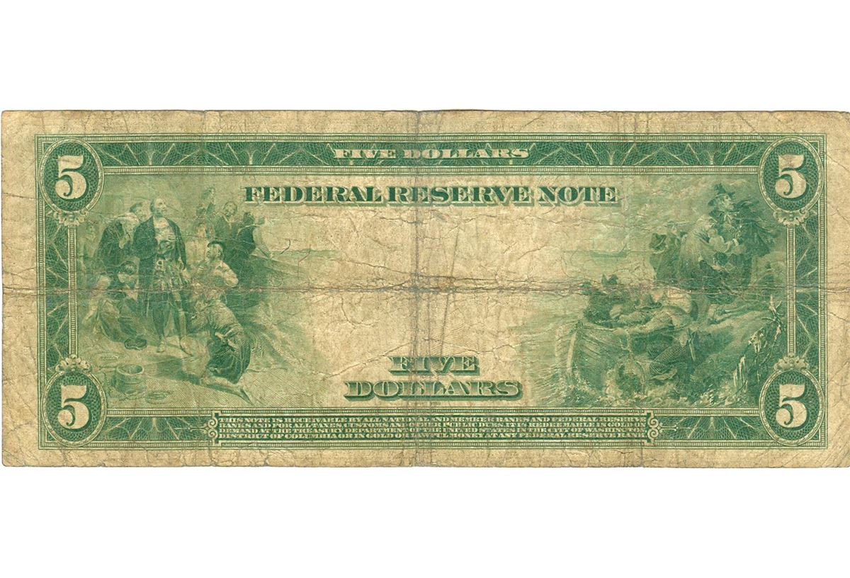 One 1914 $5 Blue Seal Federal Reserve Note.