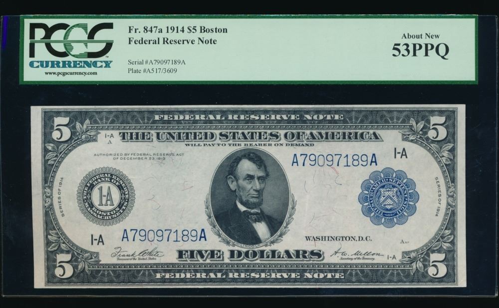 One 1914 $5 Boston FRN PCGS 53PPQ.