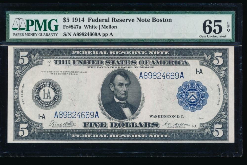 One 1914 $5 Boston FRN PMG 65EPQ.