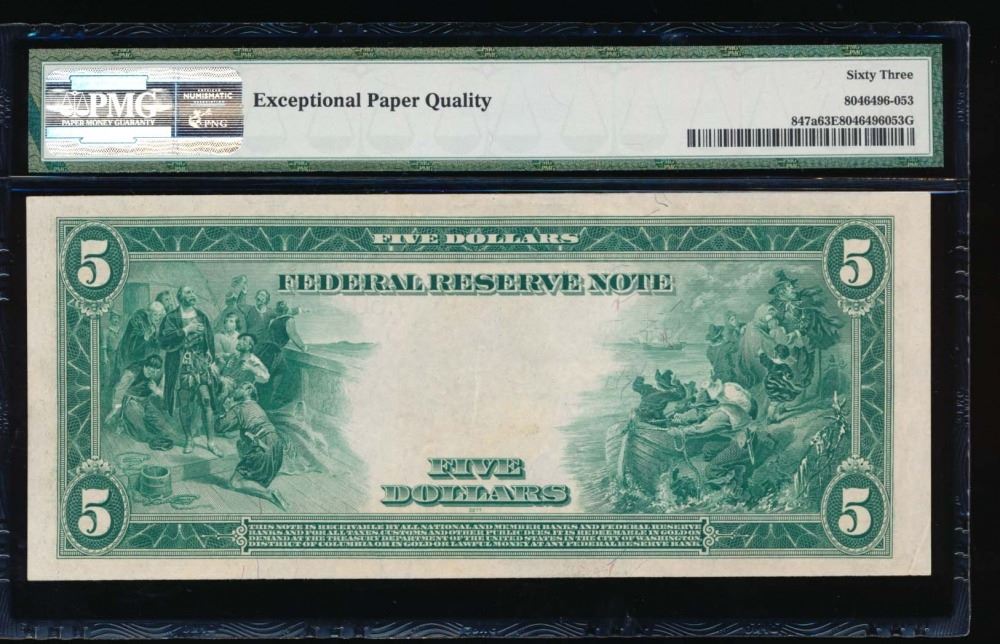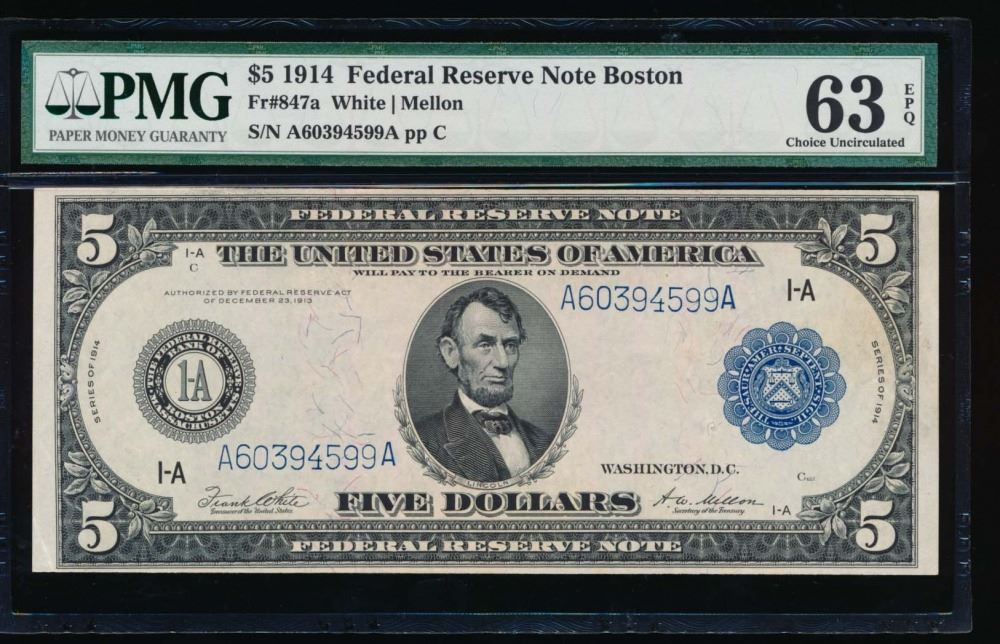 One 1914 $5 Boston Federal Reserve Note PMG 63EPQ.