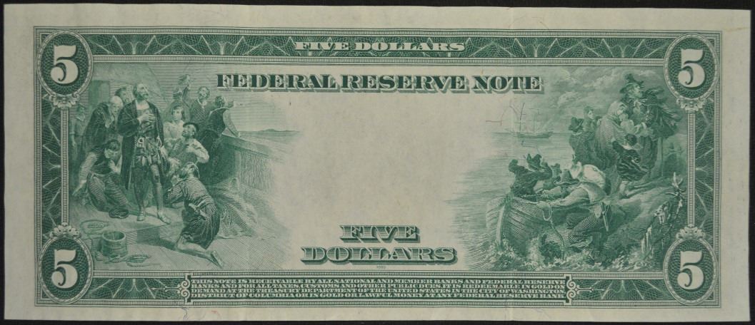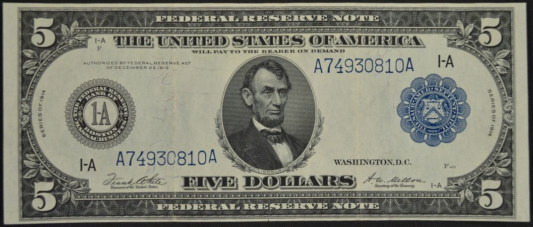 One 1914 $5 Boston Federal Reserve Note.