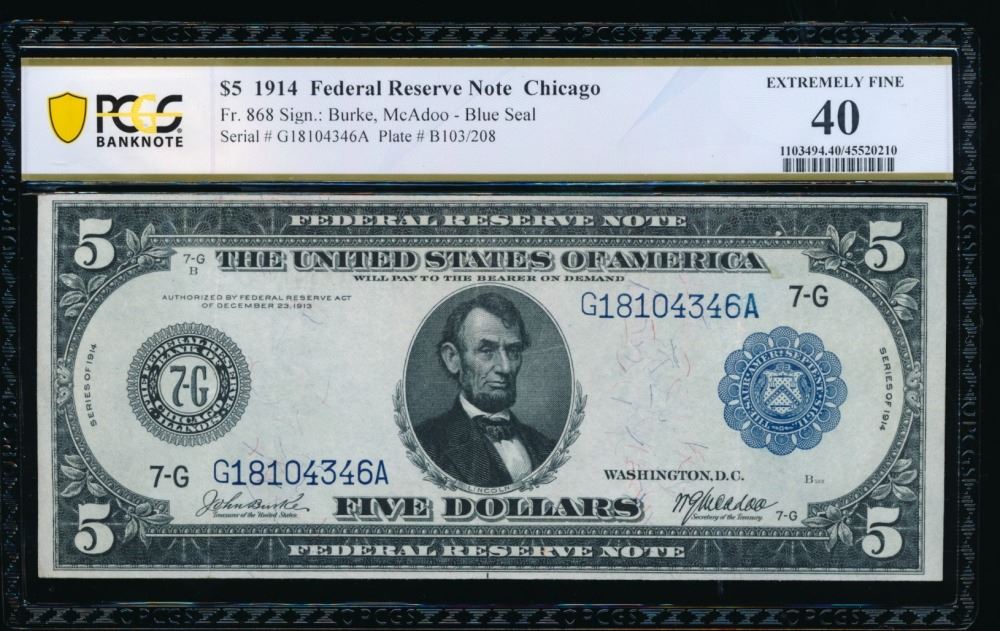 One 1914 $5 Chicago FRBN PCGS 40.