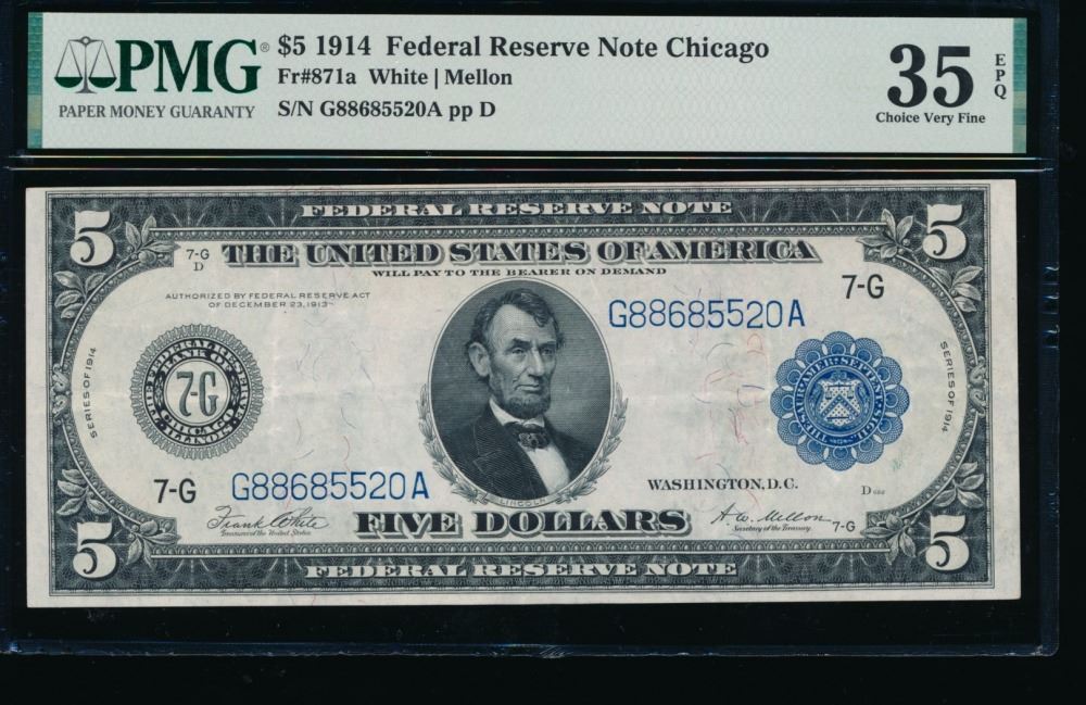 One 1914 $5 Chicago FRN PMG 35EPQ.