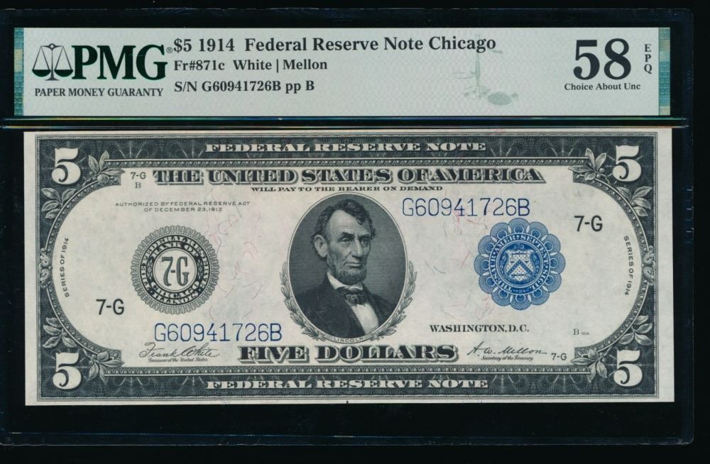 One 1914 $5 Chicago FRN PMG 58EPQ.