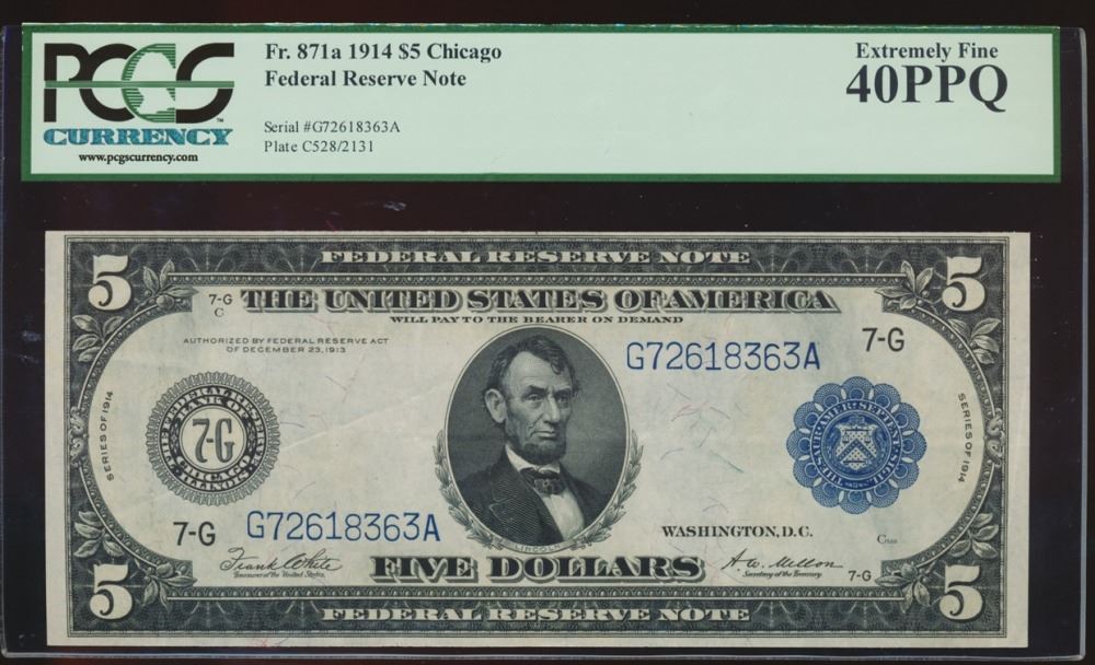 One 1914 $5 Chicago Federal Reserve Note PCGS 40PPQ.