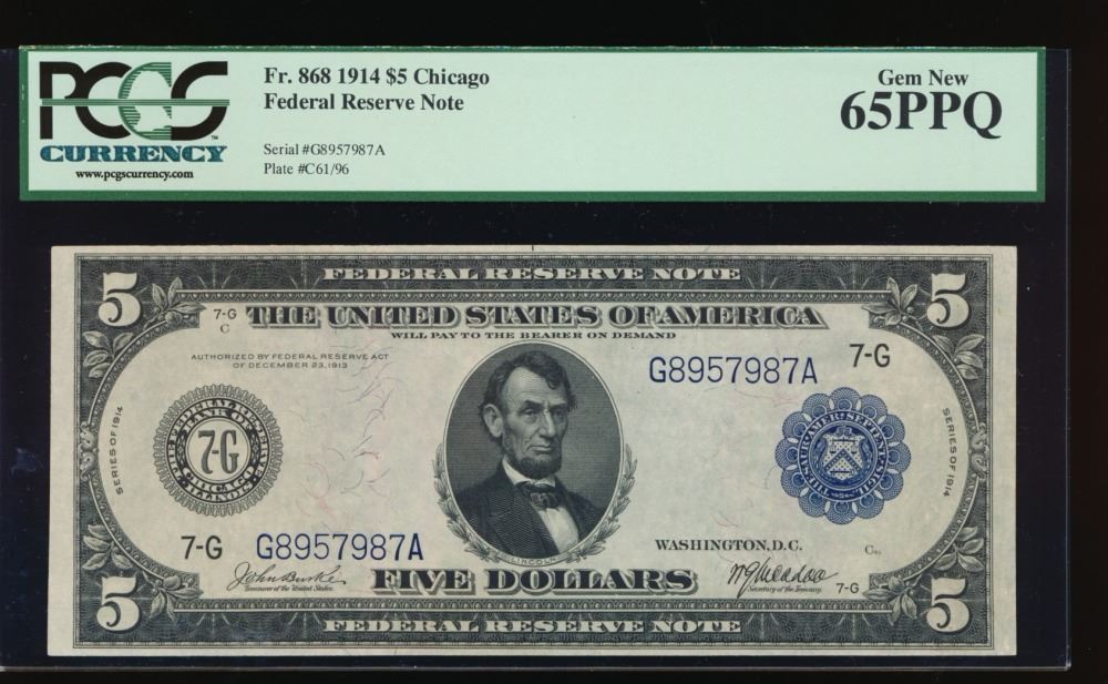 One 1914 $5 Chicago Federal Reserve Note PCGS 65PPQ.