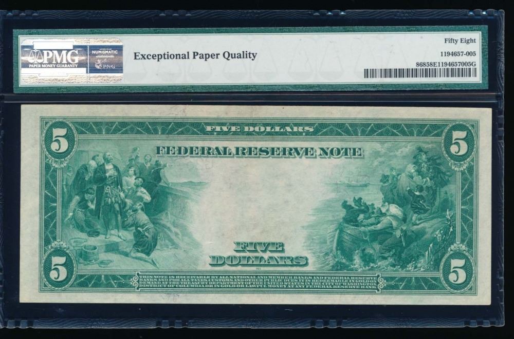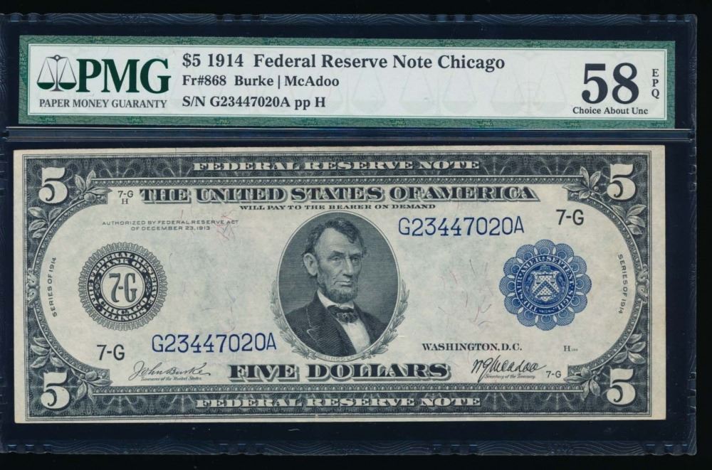 One 1914 $5 Chicago Federal Reserve Note PMG 58EPQ.