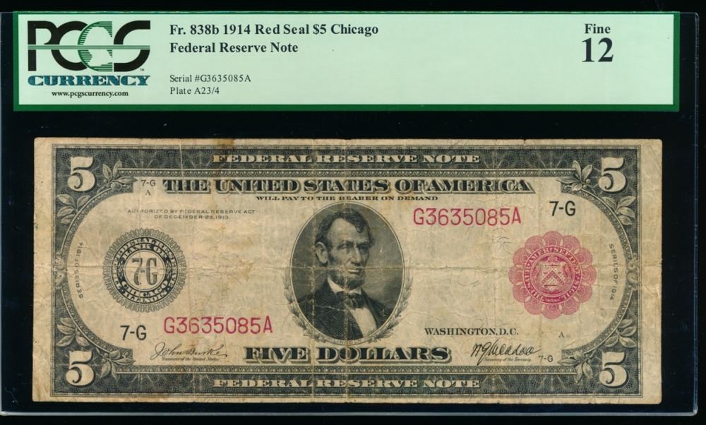 One 1914 $5 Chicago Red Seal Federal Reserve Note PCGS 12.
