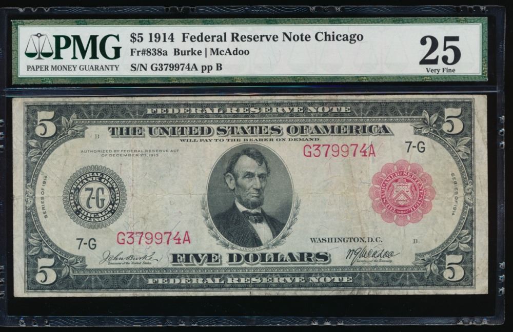 One 1914 $5 Chicago Red Seal Federal Reserve Note PMG 25.