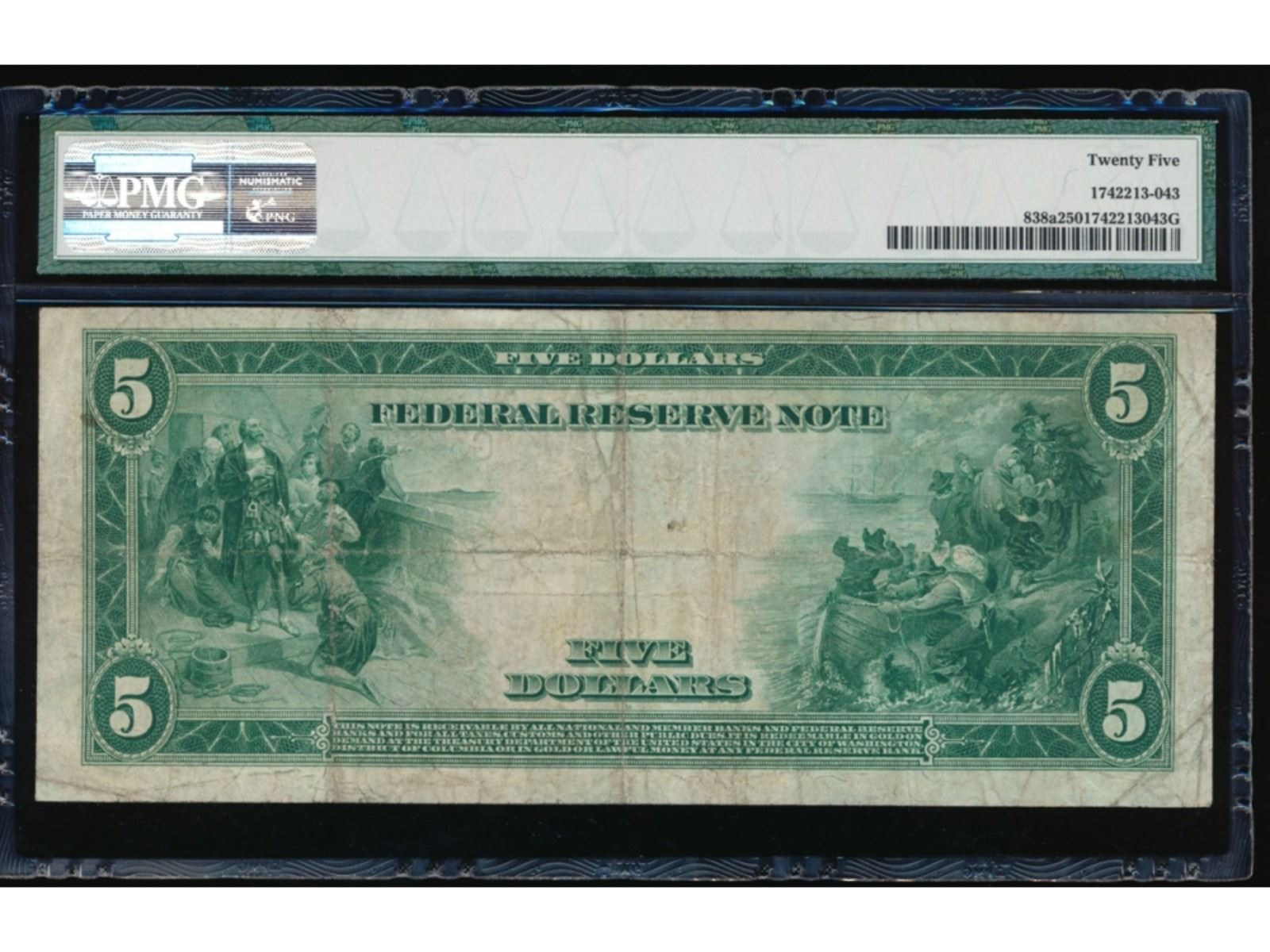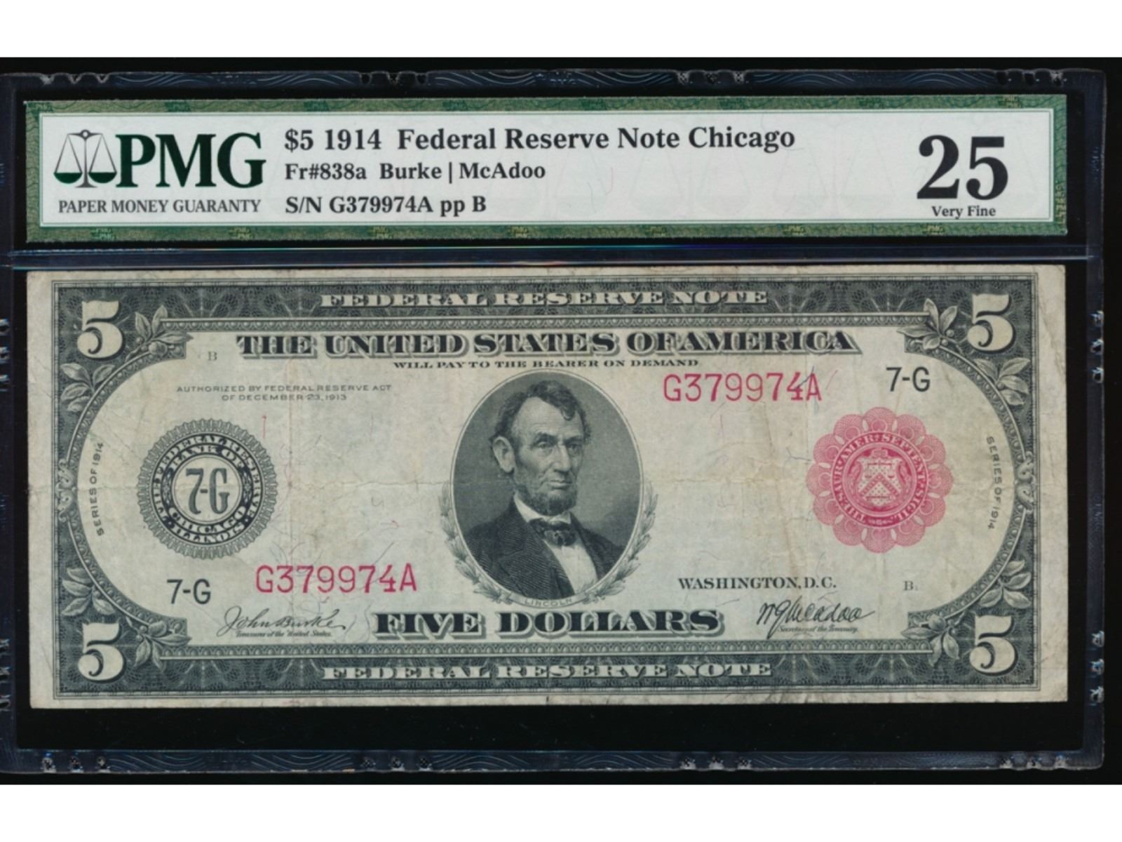 One 1914 $5 Chicago Red Seal Federal Reserve Note PMG 25.