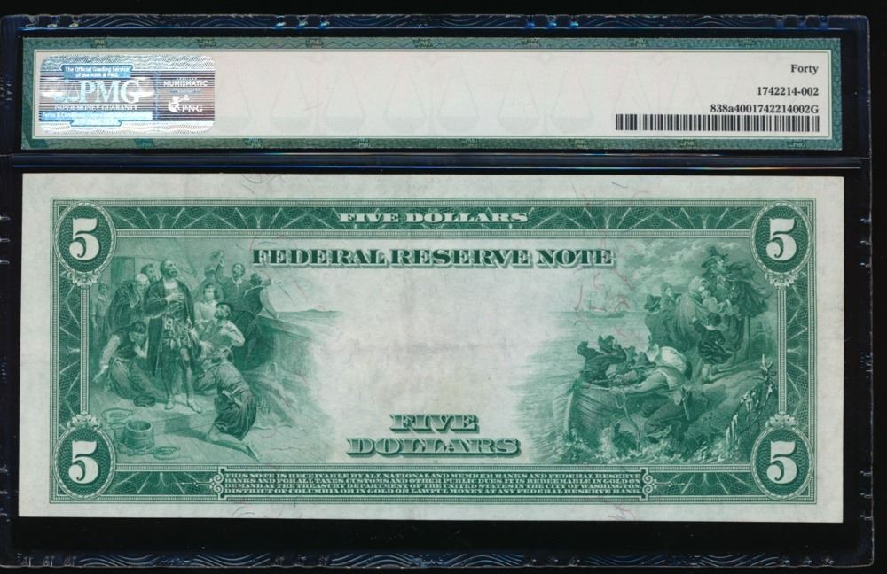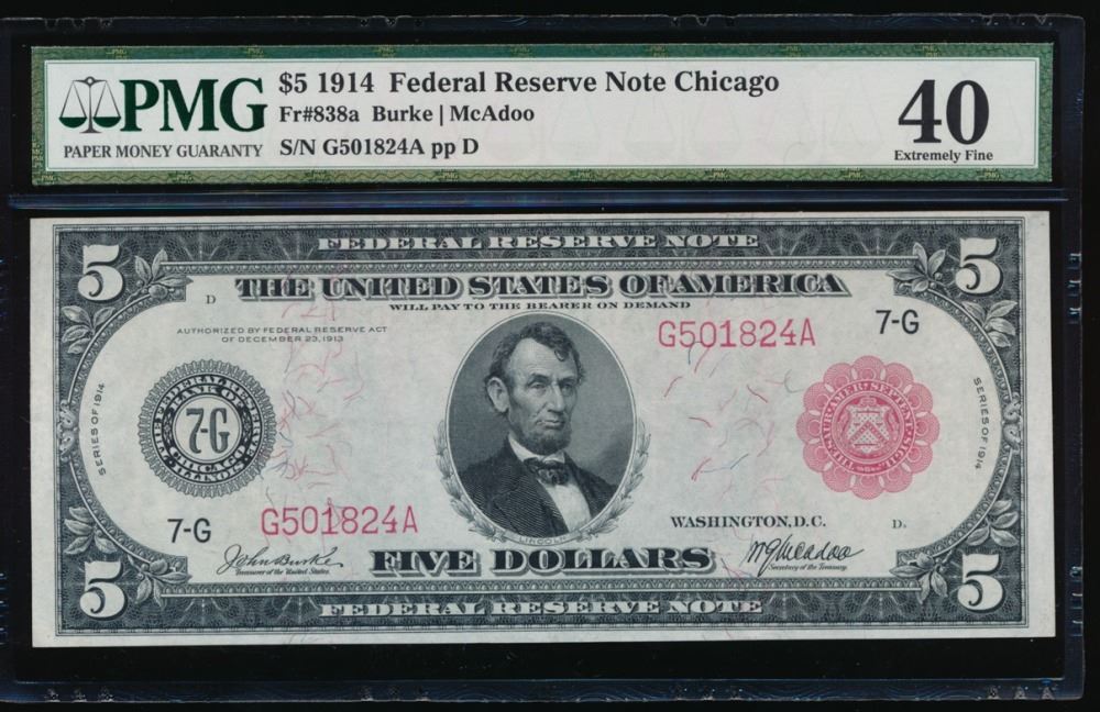 One 1914 $5 Chicago Red Seal Federal Reserve Note PMG 40.