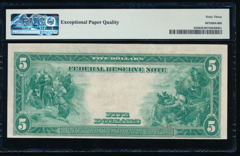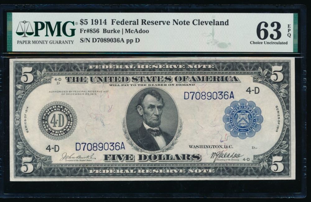 One 1914 $5 Cleveland FRN PMG 63EPQ.