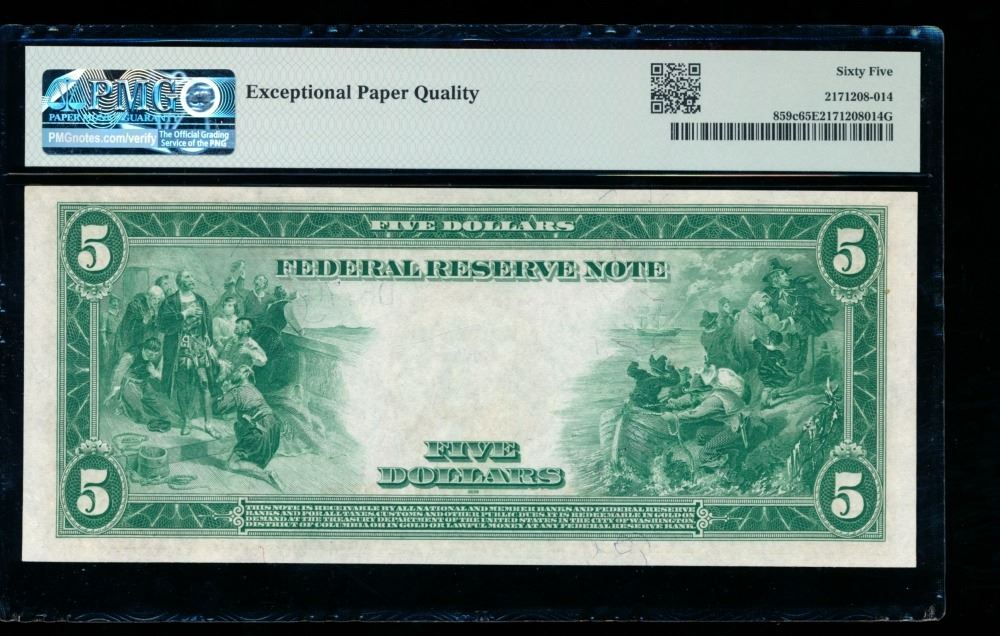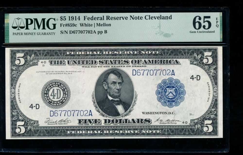 One 1914 $5 Cleveland FRN PMG 65EPQ.