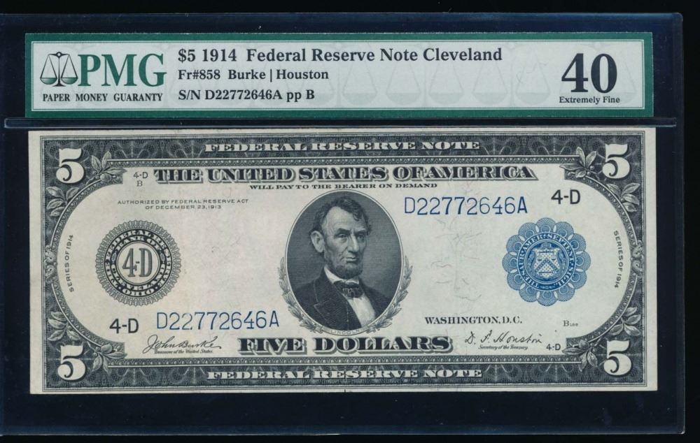 One 1914 $5 Cleveland Federal Reserve Note PMG 40.