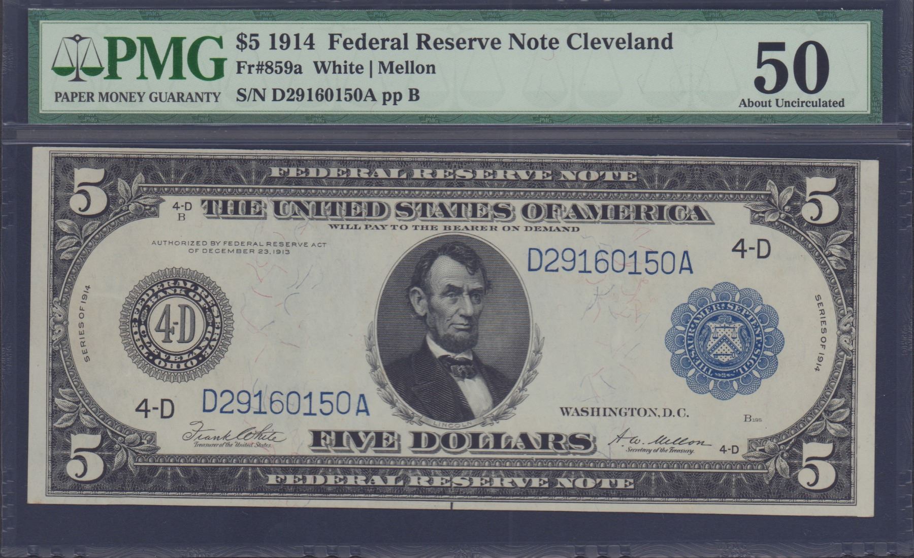 One 1914 $5 Cleveland Federal Reserve Note PMG 50.