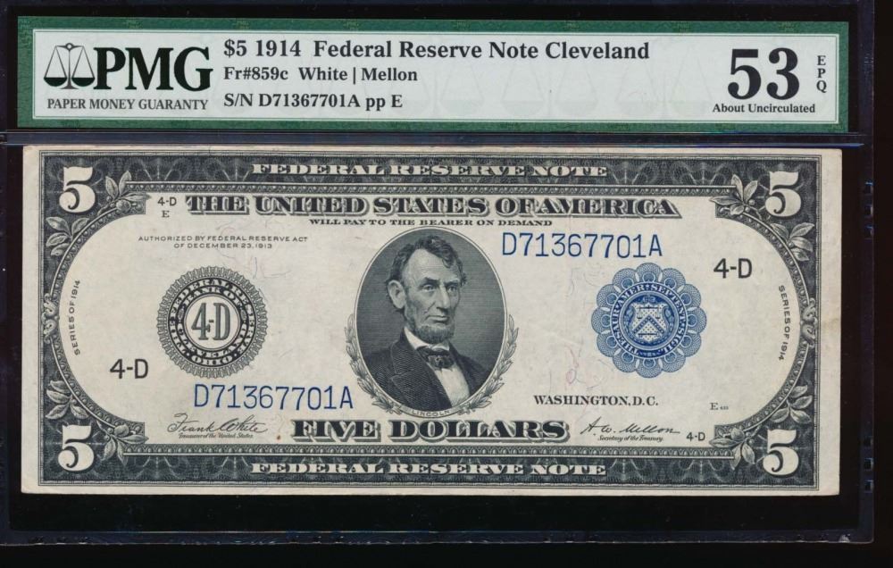 One 1914 $5 Cleveland Federal Reserve Note PMG 53EPQ.