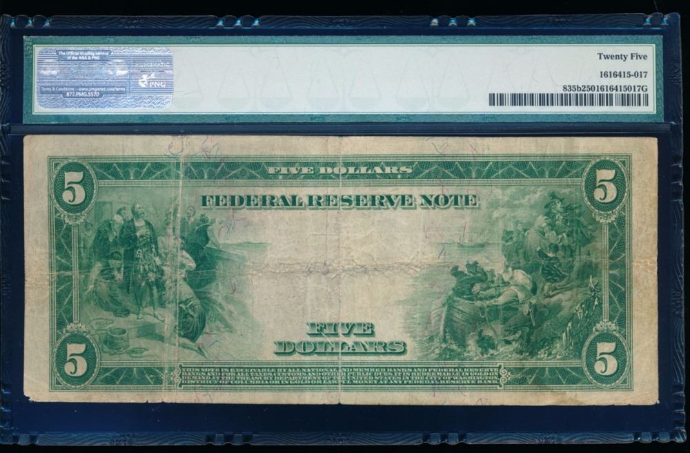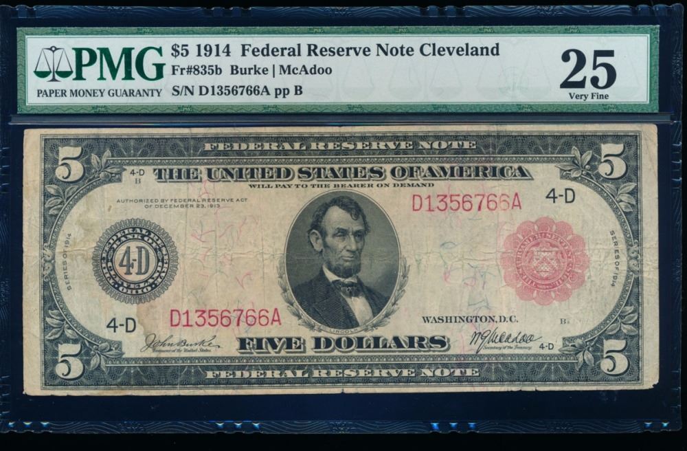 One 1914 $5 Cleveland Red Seal Note PMG 25.