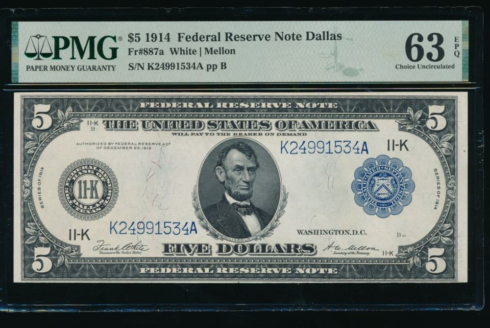 One 1914 $5 Dallas FRN PMG 63EPQ.