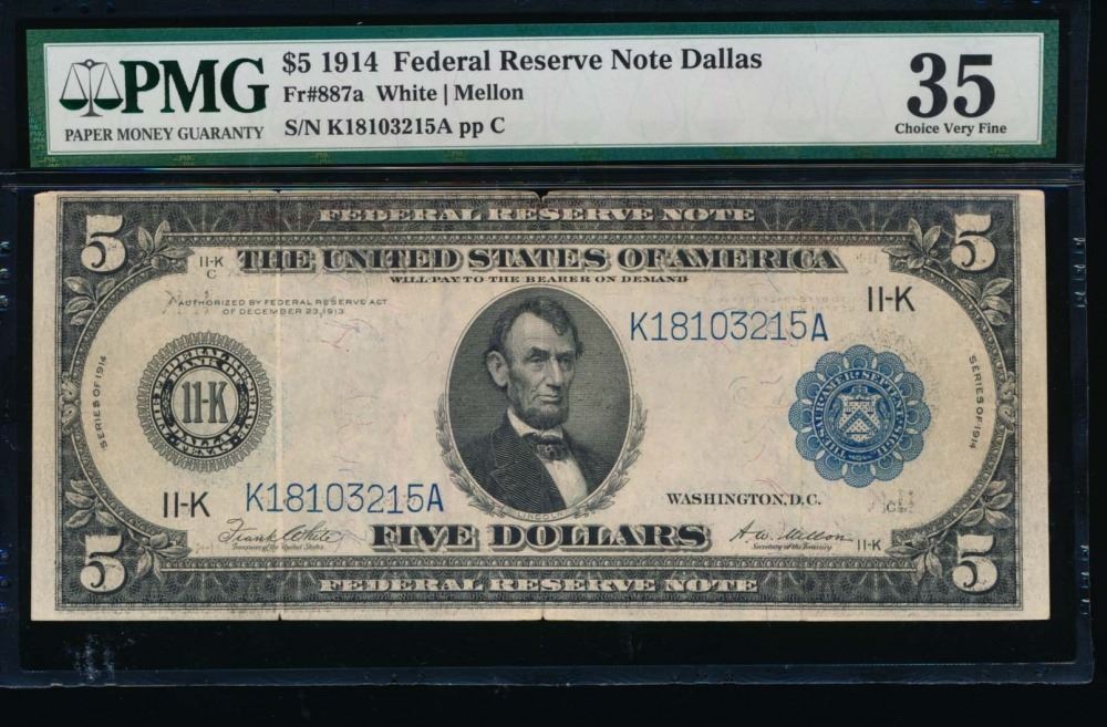 One 1914 $5 Dallas Federal Reserve Note PMG 35.