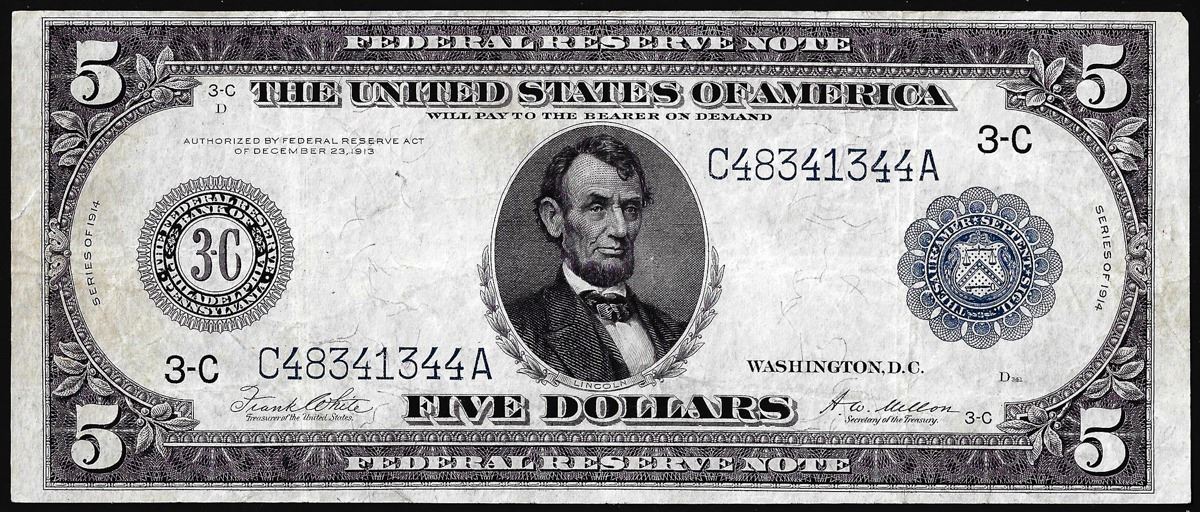 One 1914 $5 Federal Reserve Bank Note Chicago.