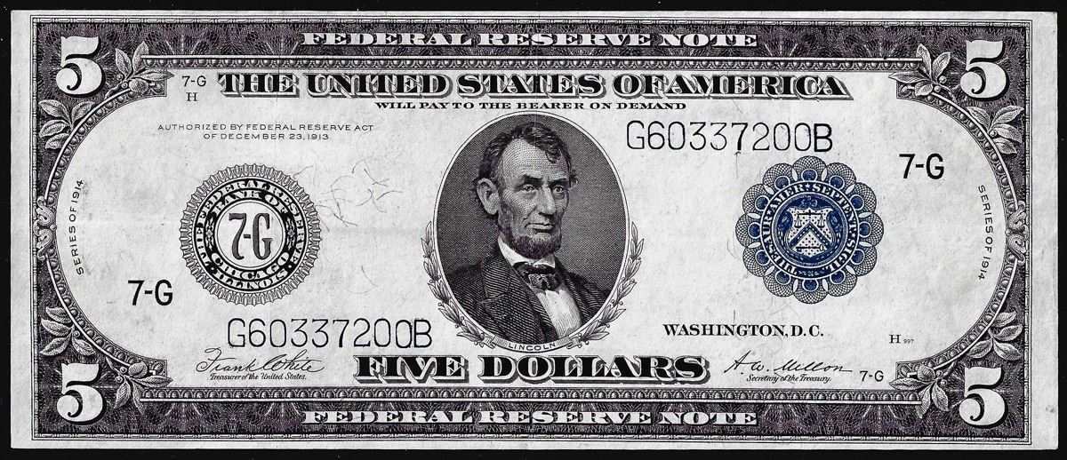 One 1914 $5 Federal Reserve Bank Note Chicago.