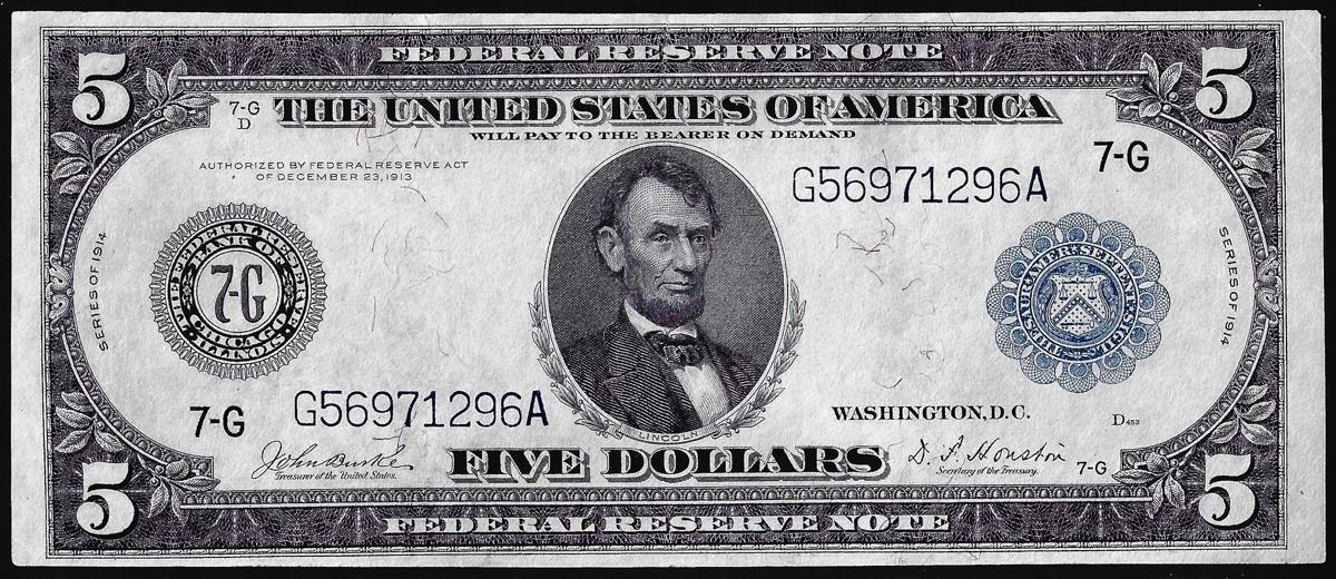 One 1914 $5 Federal Reserve Bank Note Chicago.
