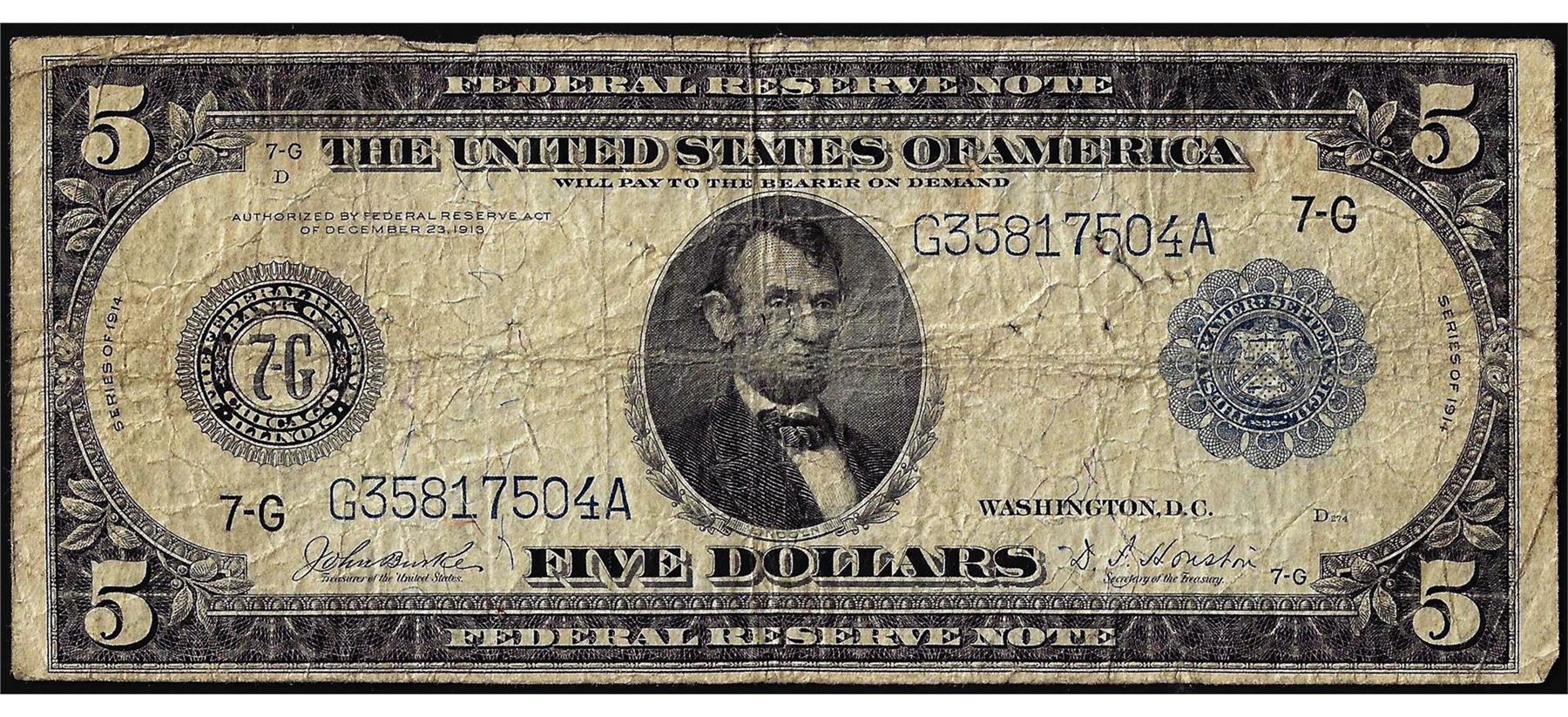 One 1914 $5 Federal Reserve Bank Note Chicago.