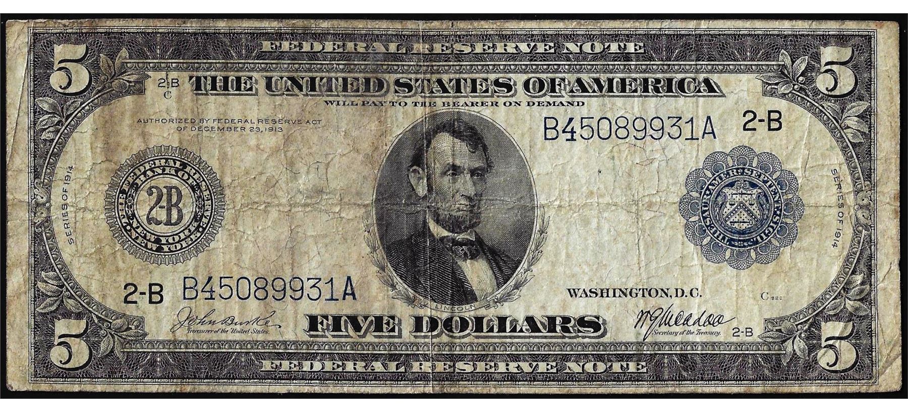 One 1914 $5 Federal Reserve Bank Note New York.