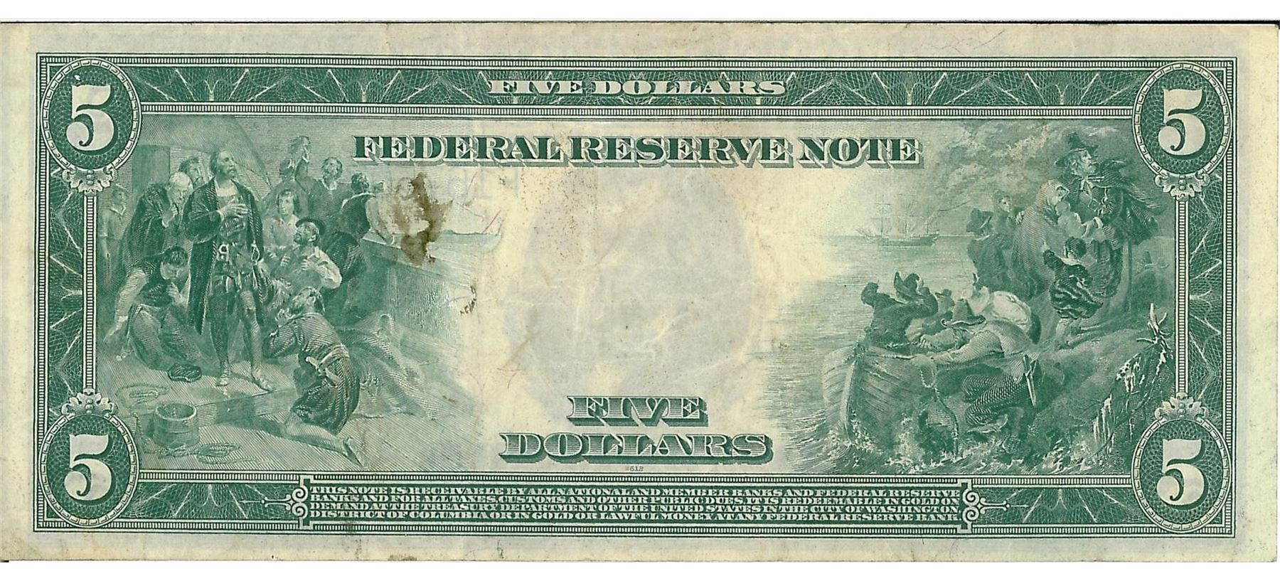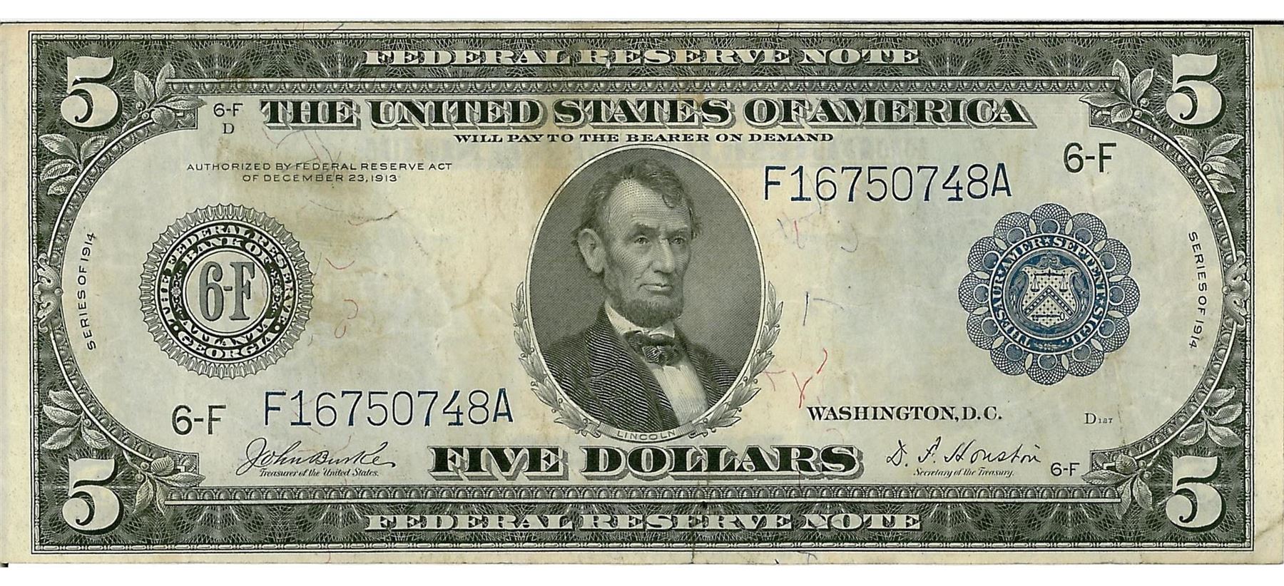 One 1914 $5 Federal Reserve Bank Note. The serial number is 16750748.