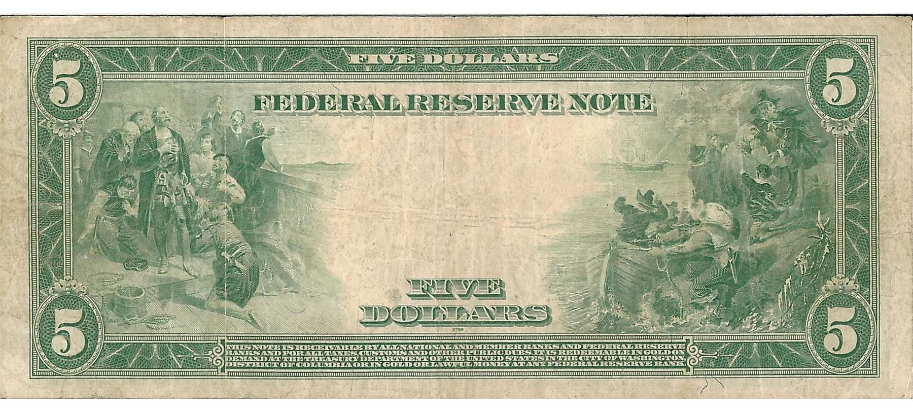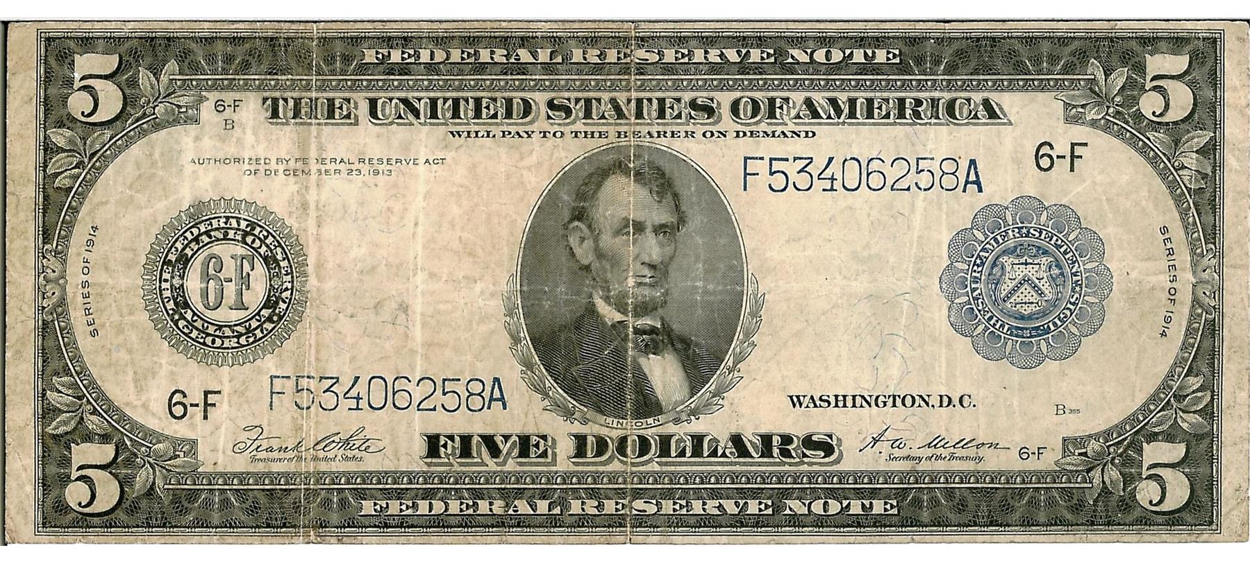One 1914 $5 Federal Reserve Bank Note. The serial number is 53406258.