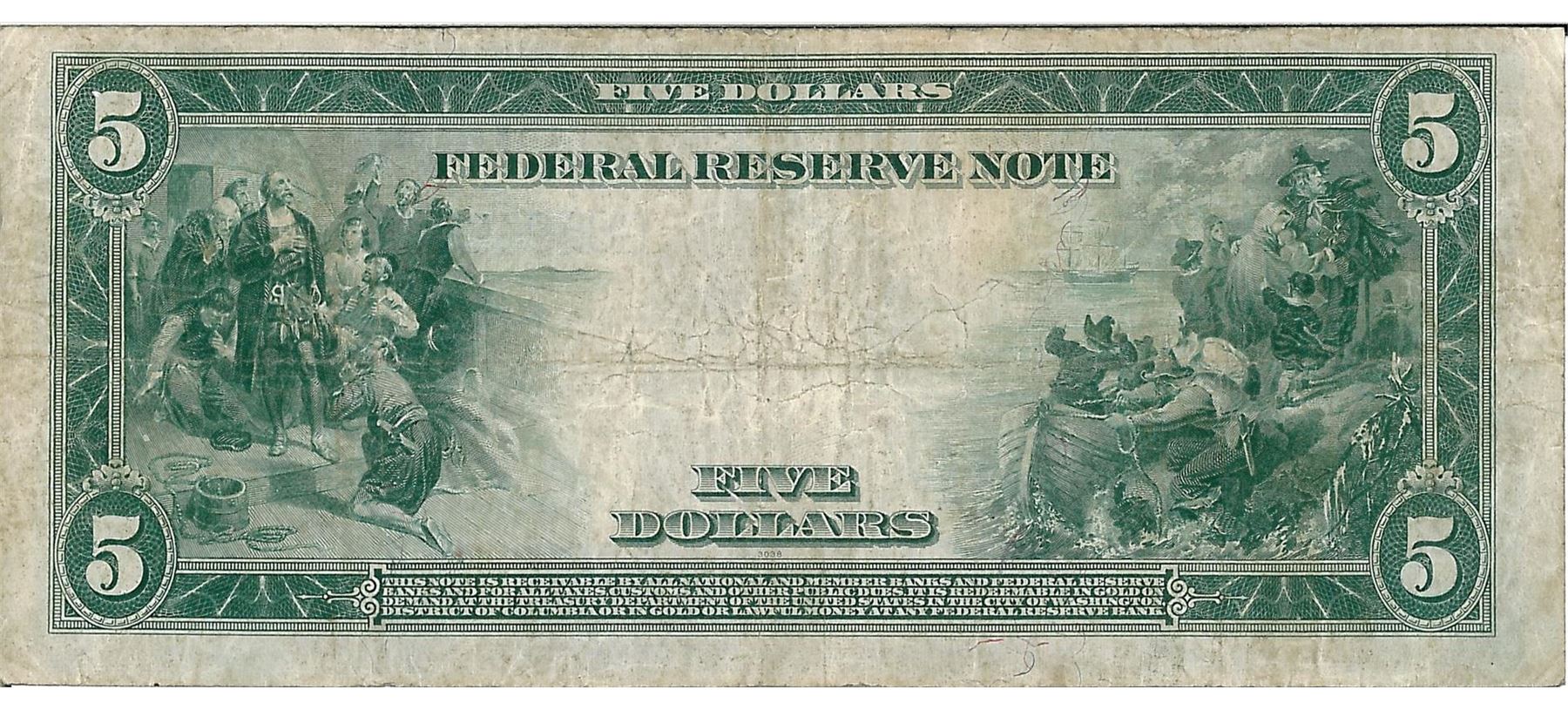 One 1914 $5 Federal Reserve Bank Note. The serial number is 85949685.