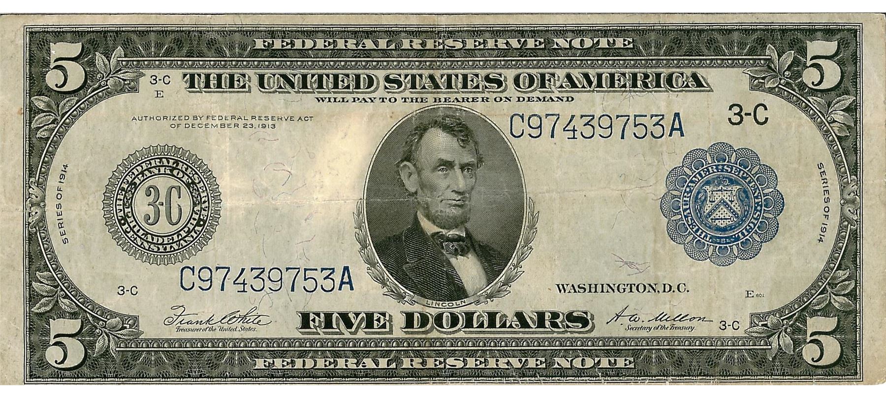 One 1914 $5 Federal Reserve Bank Note. The serial number is 97439753.