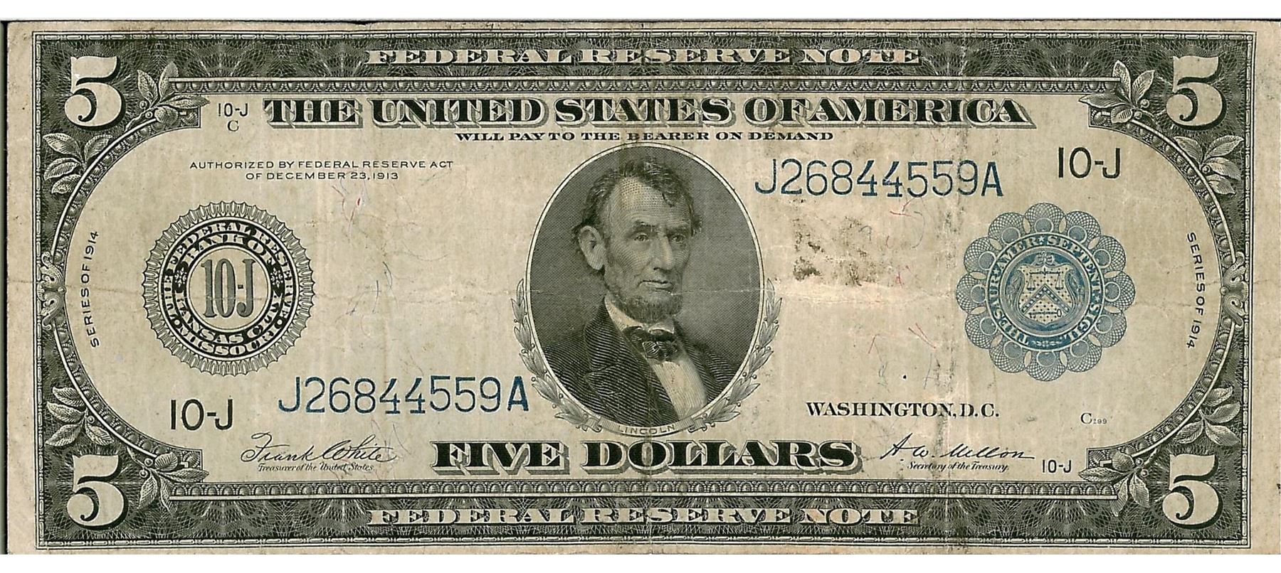 One 1914 $5 Federal Reserve Bank Note. The serial number is 26844559.