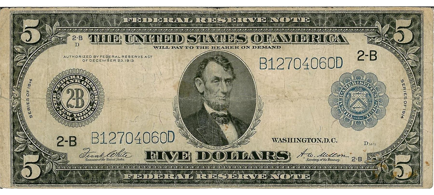 One 1914 $5 Federal Reserve Bank Note. The serial number is 12704060.
