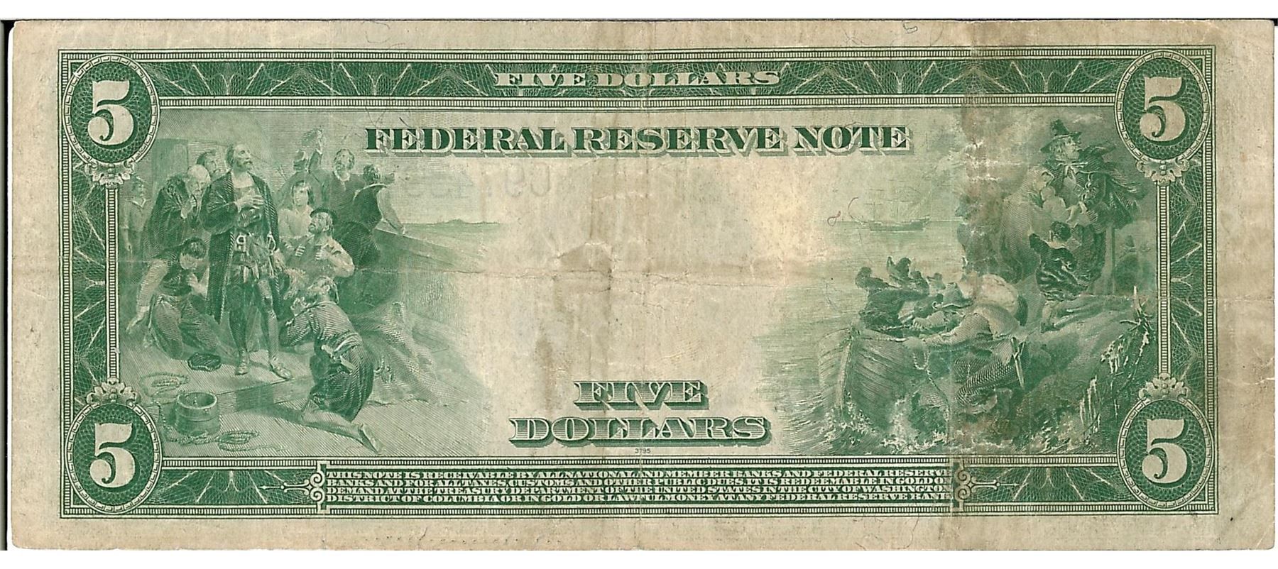 One 1914 $5 Federal Reserve Bank Note. The serial number is 97439753.