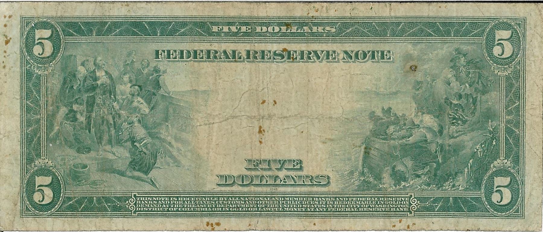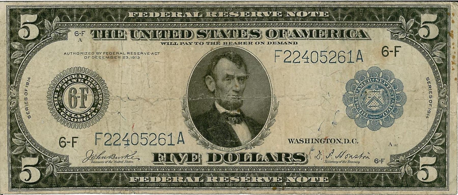 One 1914 $5 Federal Reserve Bank Note. The serial number is 22405261.