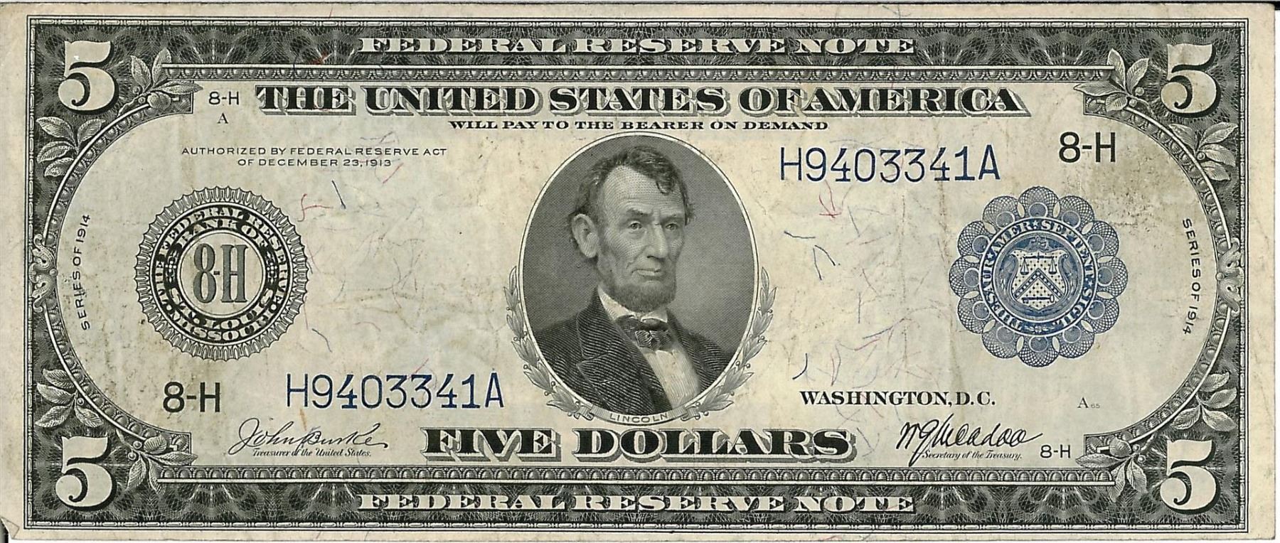 One 1914 $5 Federal Reserve Bank Note. The serial number is 9403341.