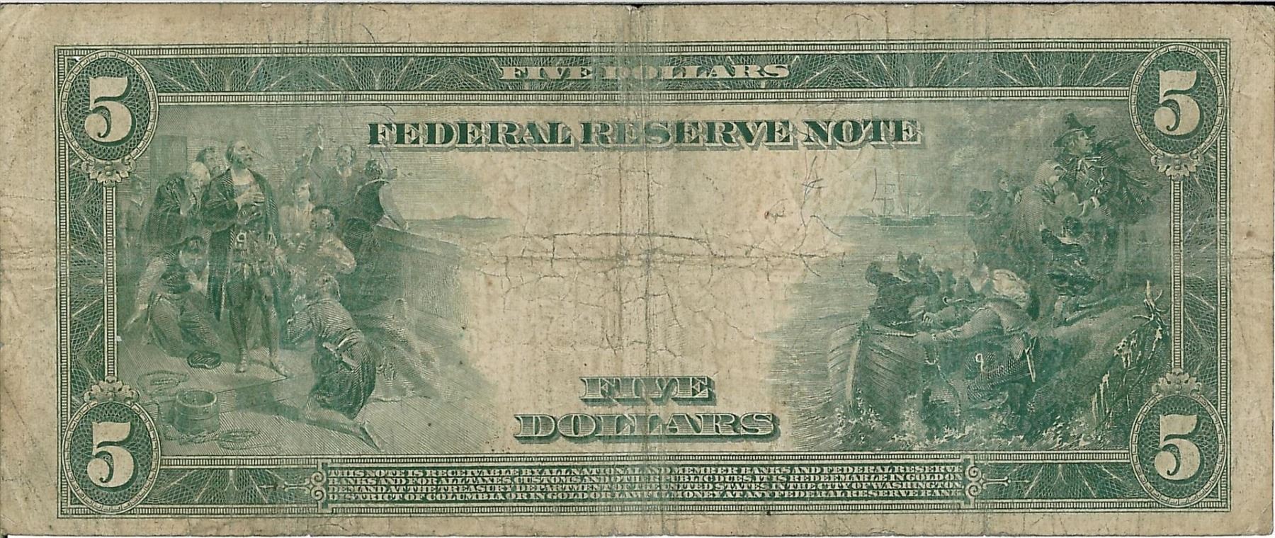 One 1914 $5 Federal Reserve Bank Note. The serial number is 32129774.