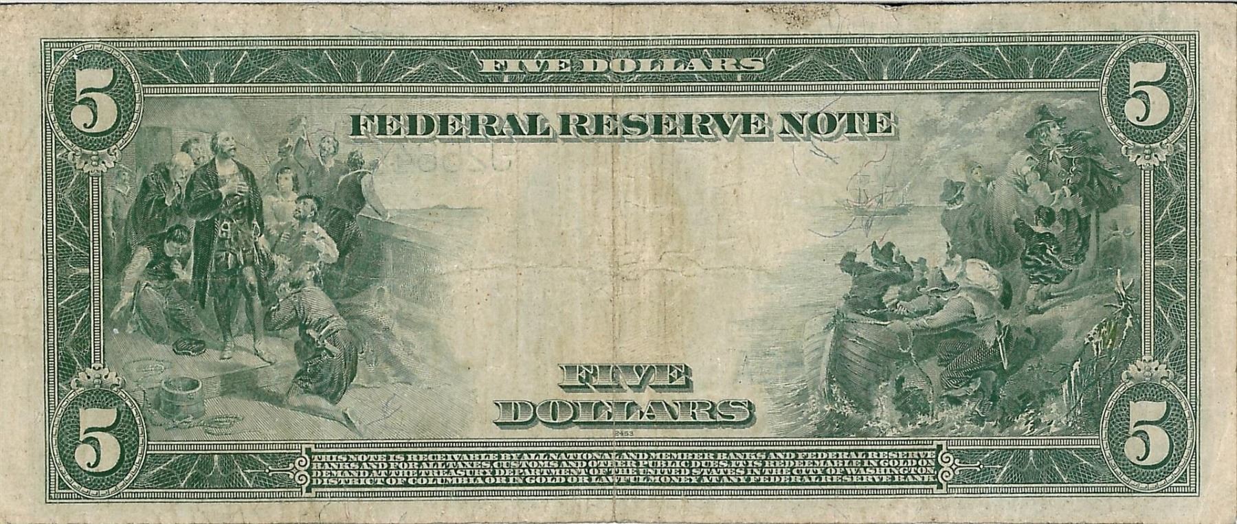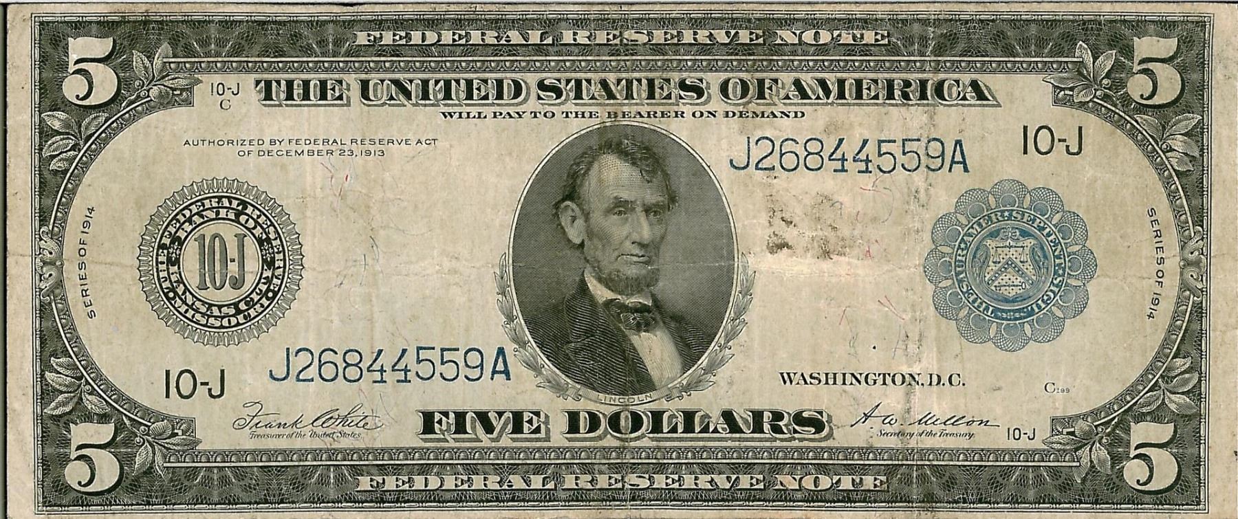 One 1914 $5 Federal Reserve Bank Note. The serial number is 26844559.