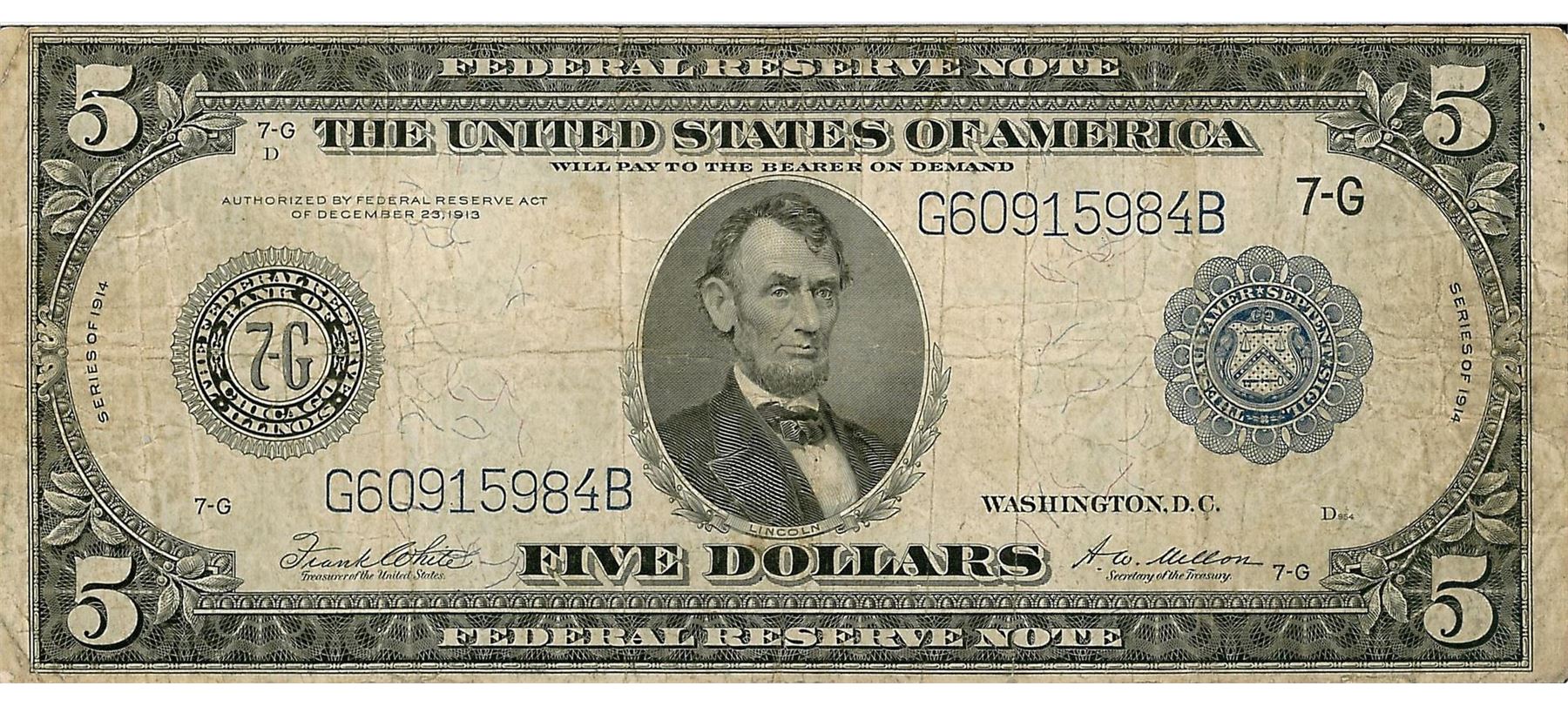 One 1914 $5 Federal Reserve Bank Note. The serial number is 60915984.