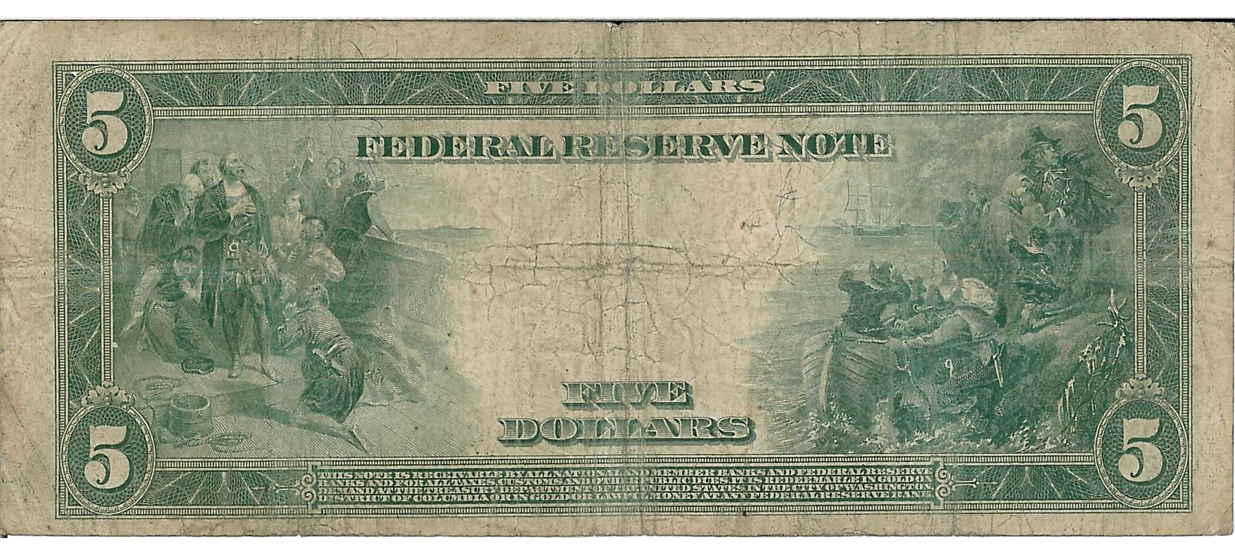 One 1914 $5 Federal Reserve Bank Note. The serial number is 32129774.