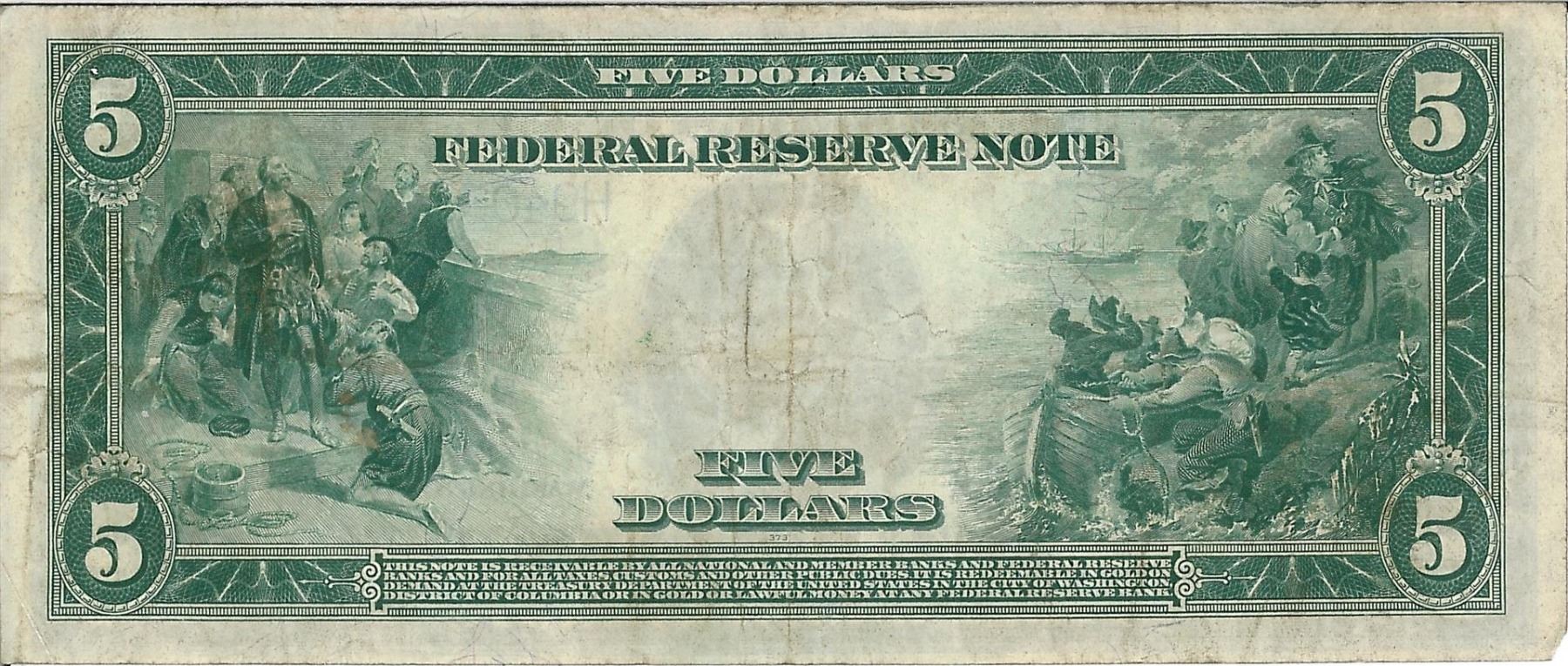 One 1914 $5 Federal Reserve Bank Note. The serial number is 9403341.