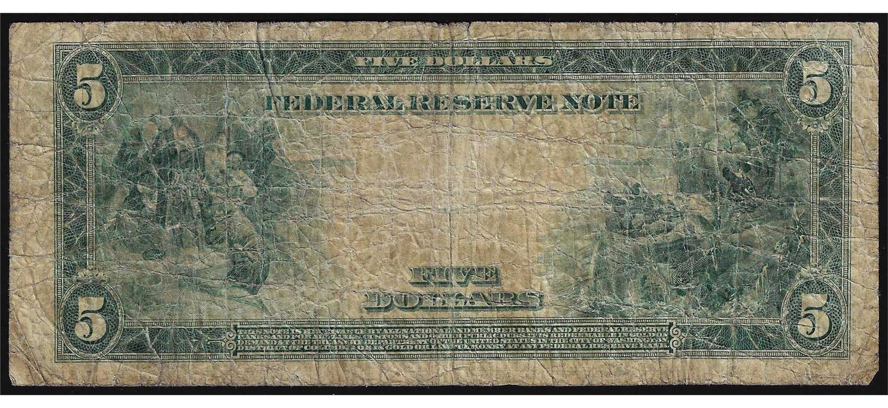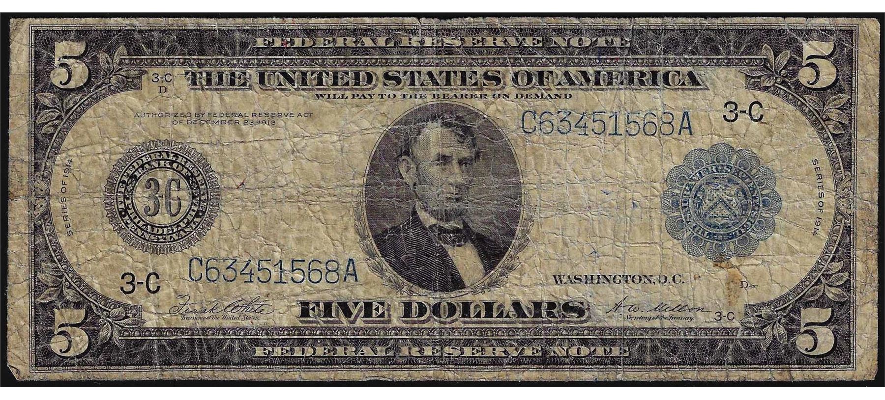 One 1914 $5 Federal Reserve Blue Seal Note.