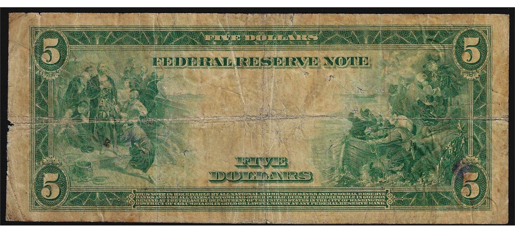 One 1914 $5 Federal Reserve Blue Seal Note.