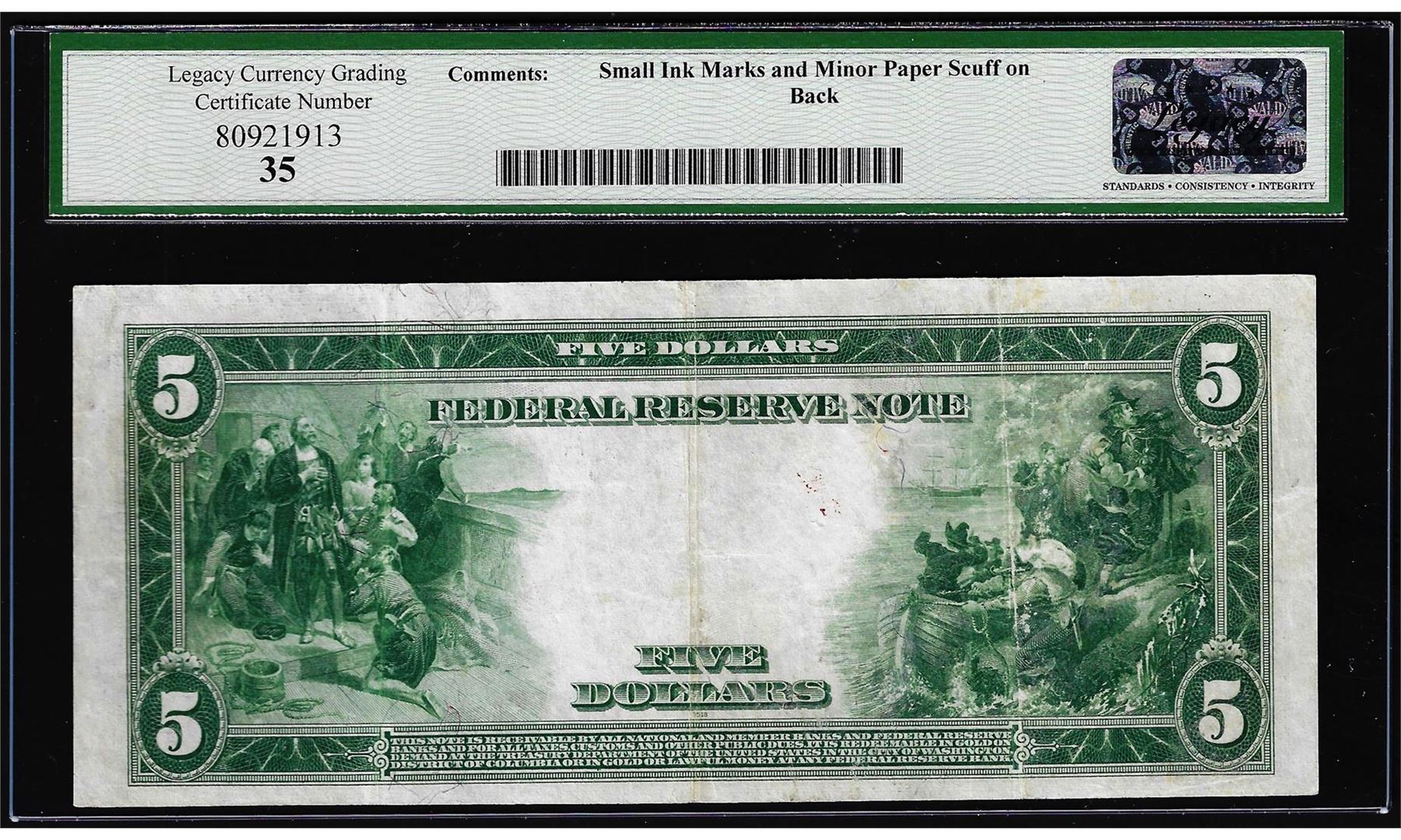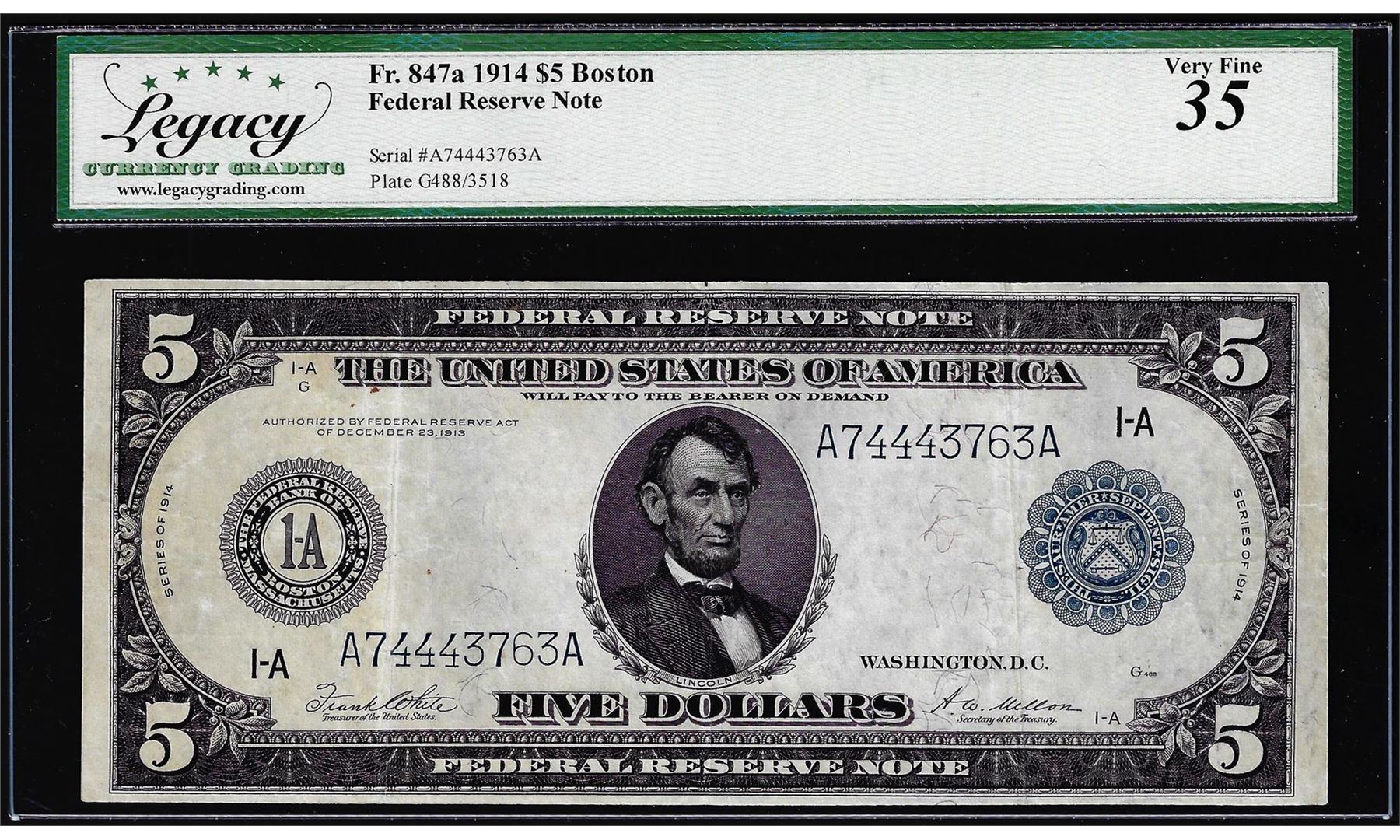 One 1914 $5 Federal Reserve Note Boston Fr.847a Legacy Very Fine 35. Legacy Graded.