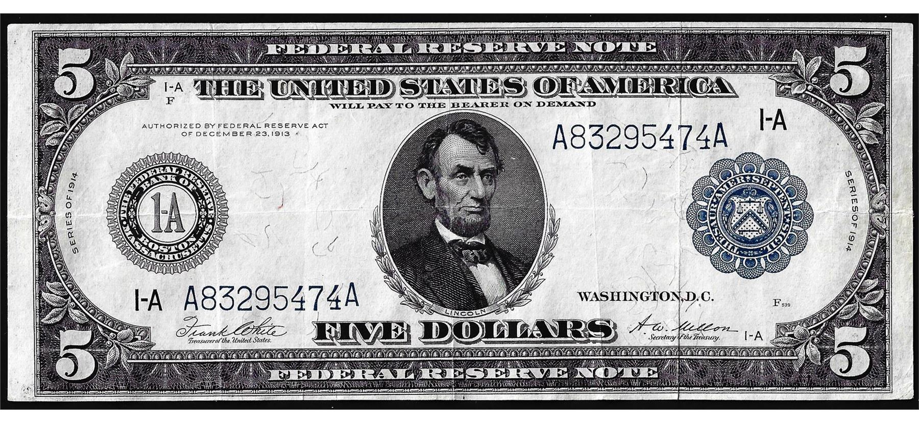 One 1914 $5 Federal Reserve Note Boston.