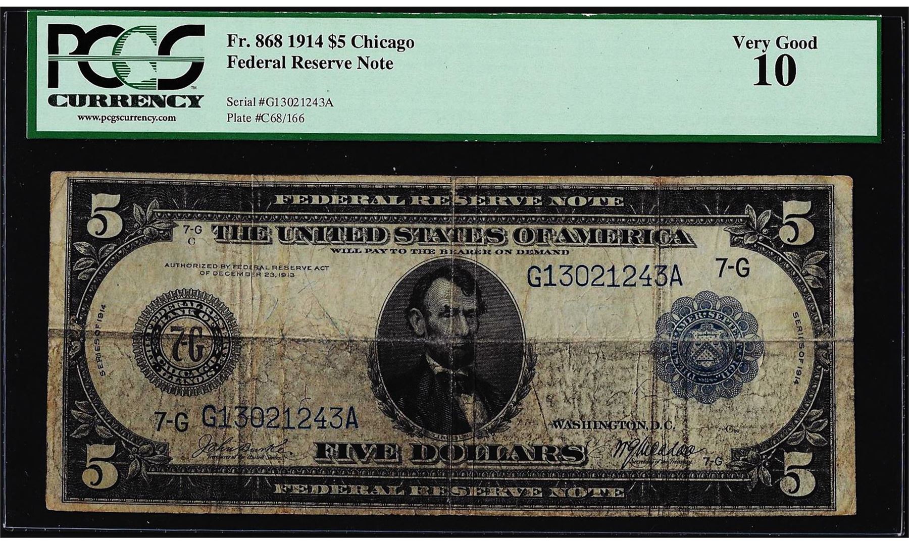 One 1914 $5 Federal Reserve Note Chicago Fr.868 PCGS Very Good 10. PCGS Graded.