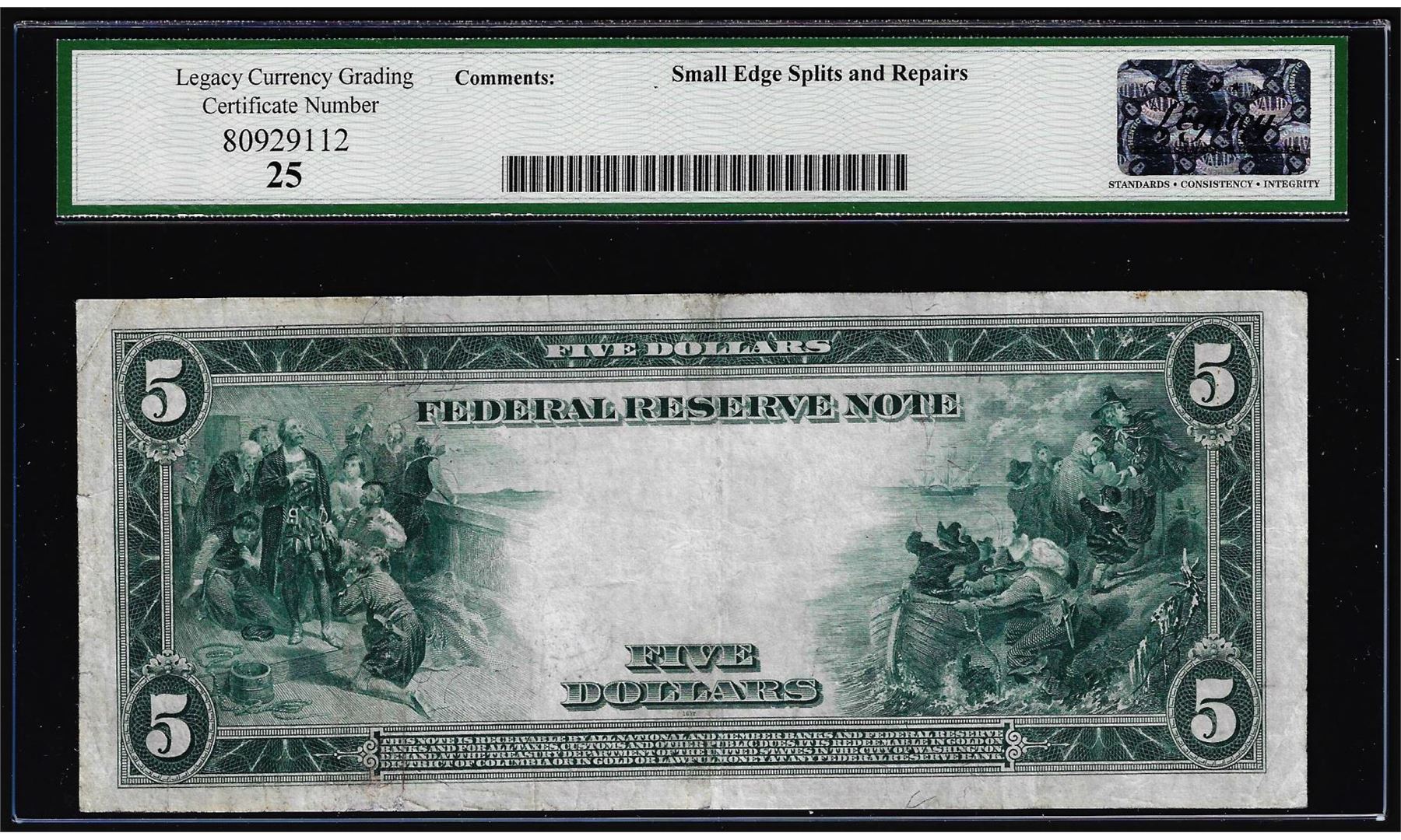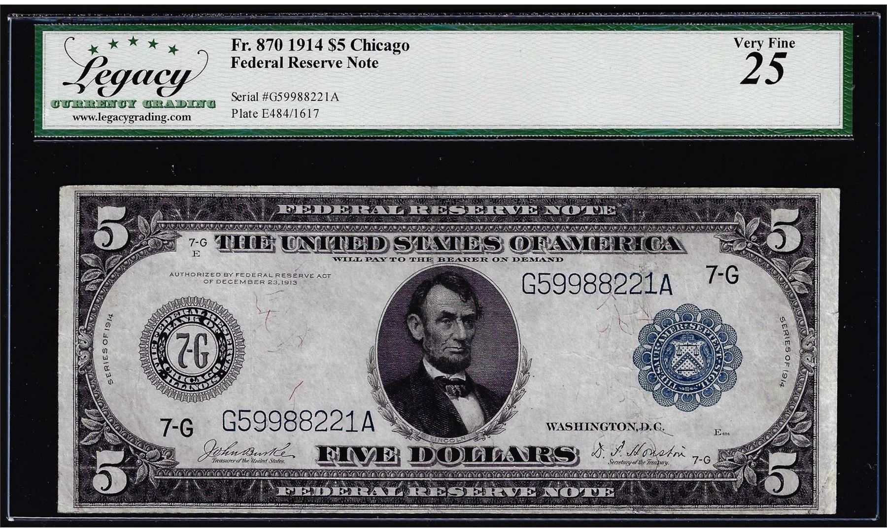 One 1914 $5 Federal Reserve Note Chicago Fr.870 Legacy Very Fine 25. Legacy Graded.